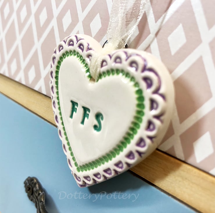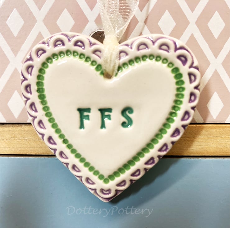 This little heart is made from white earthenware clay, imprinted with the words FFS. The perfect gift to let someone know how much you love them! Some of the letters may be a bit higgledy piggledy but they have been stamped with love! It has been fired twice, once to the bisque stage and then a second firing for the clear glaze. It measures 4.5 centimetres wide x 5cm height x 5mm thick. It can be hung outside. (The last photo is to give you an idea of size and will not be the heart that you receive)