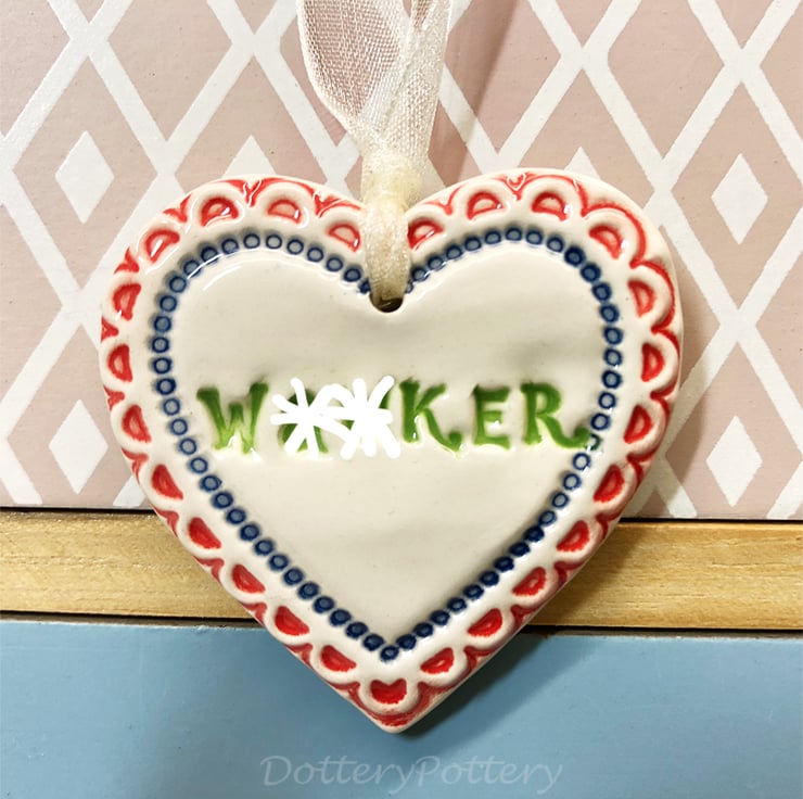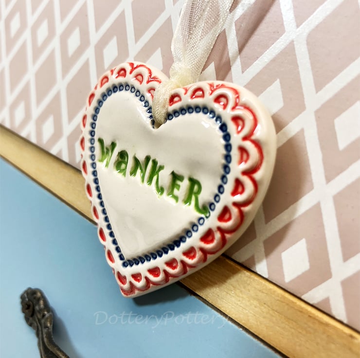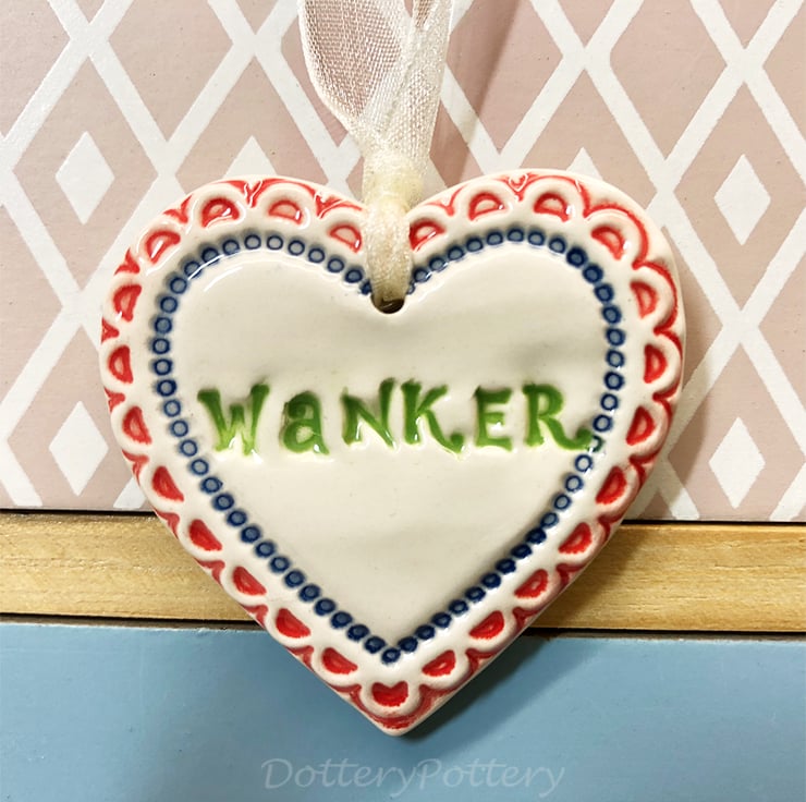 This little heart is made from white earthenware clay, imprinted with the words WANKER. The perfect gift to let someone know how much you love them! Some of the letters may be a bit higgledy piggledy but they have been stamped with love! It has been fired twice, once to the bisque stage and then a second firing for the clear glaze. It measures 4.5 centimetres wide x 5cm height x 5mm thick. It can be hung outside. (The last photo is to give you an idea of size and will not be the heart that you receive)