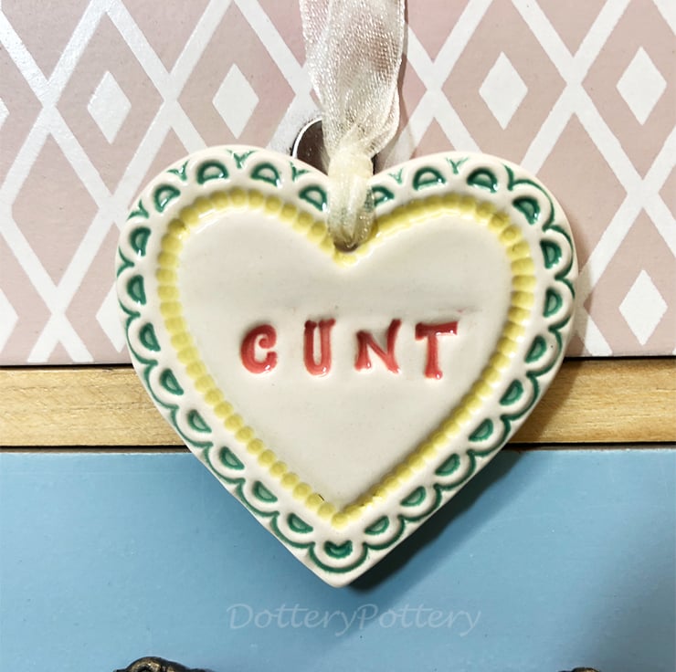 This little heart is made from white earthenware clay, imprinted with the words CUNT. The perfect gift to let someone know how much you love them! Some of the letters may be a bit higgledy piggledy but they have been stamped with love! It has been fired twice, once to the bisque stage and then a second firing for the clear glaze. It measures 4.5 centimetres wide x 5cm height x 5mm thick. It can be hung outside. (The last photo is to give you an idea of size and will not be the heart that you receive)