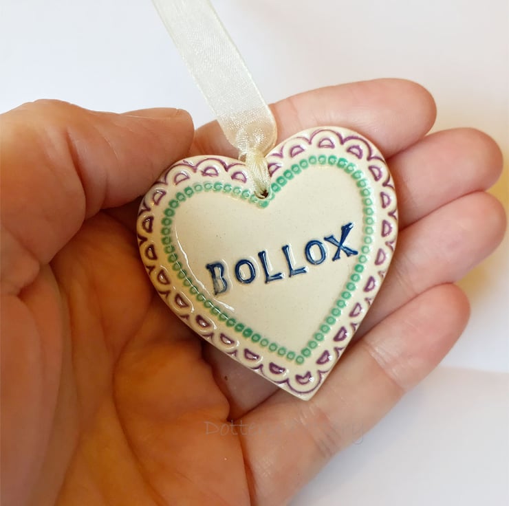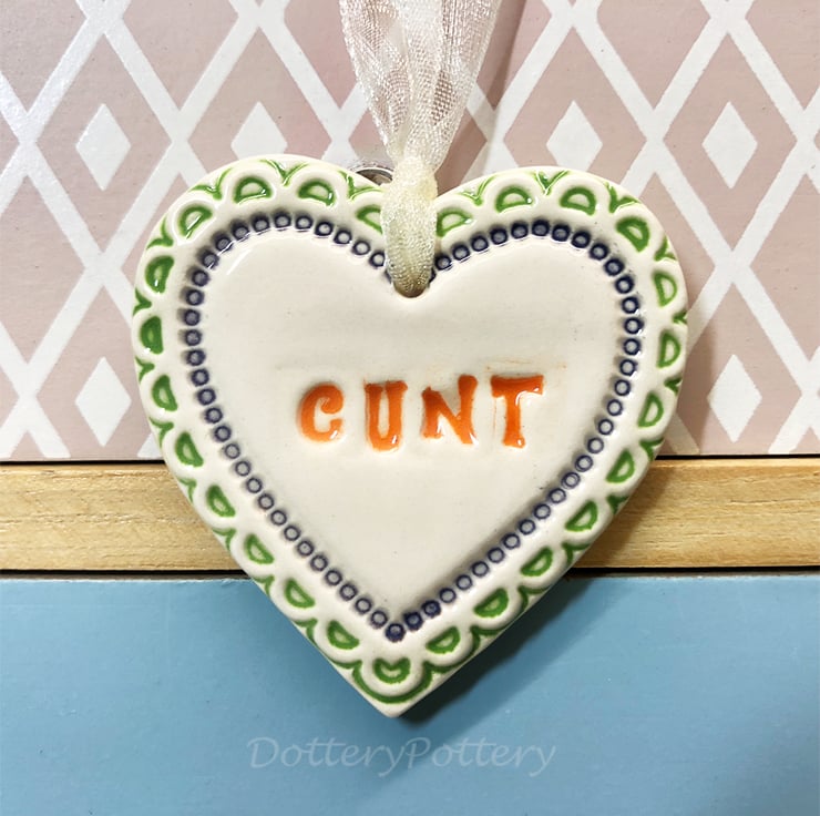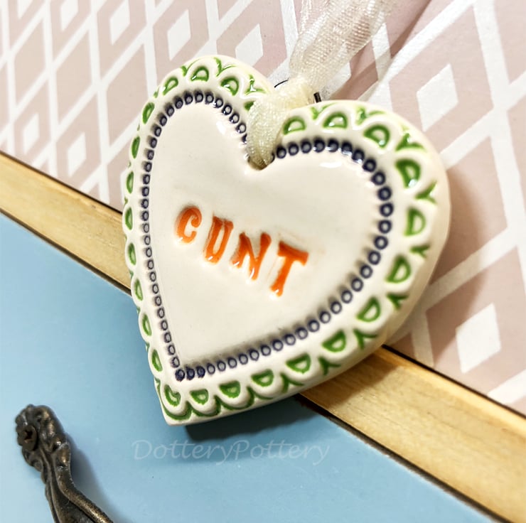 This little heart is made from white earthenware clay, imprinted with the words CUNT. The perfect gift to let someone know how much you love them! Some of the letters may be a bit higgledy piggledy but they have been stamped with love! It has been fired twice, once to the bisque stage and then a second firing for the clear glaze. It measures 4.5 centimetres wide x 5cm height x 5mm thick. It can be hung outside. (The last photo is to give you an idea of size and will not be the heart that you receive)