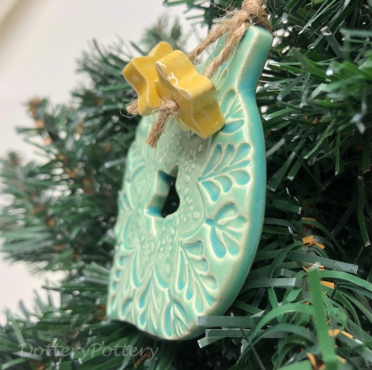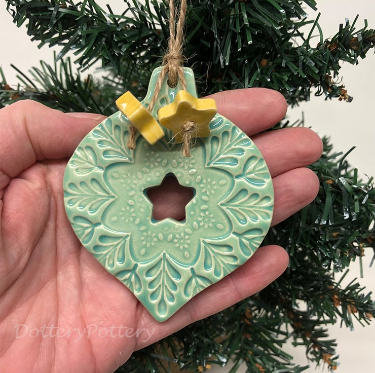 This ceramic bauble decoration has a lovely imprinted design and a cut out star to the middle. It is made from white earthenware clay and fired once, then glazed and fired again. Dangly stars hang from brown string. It measures 8cm length and 7cm width and 0.5cm deep.