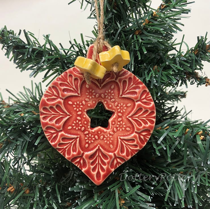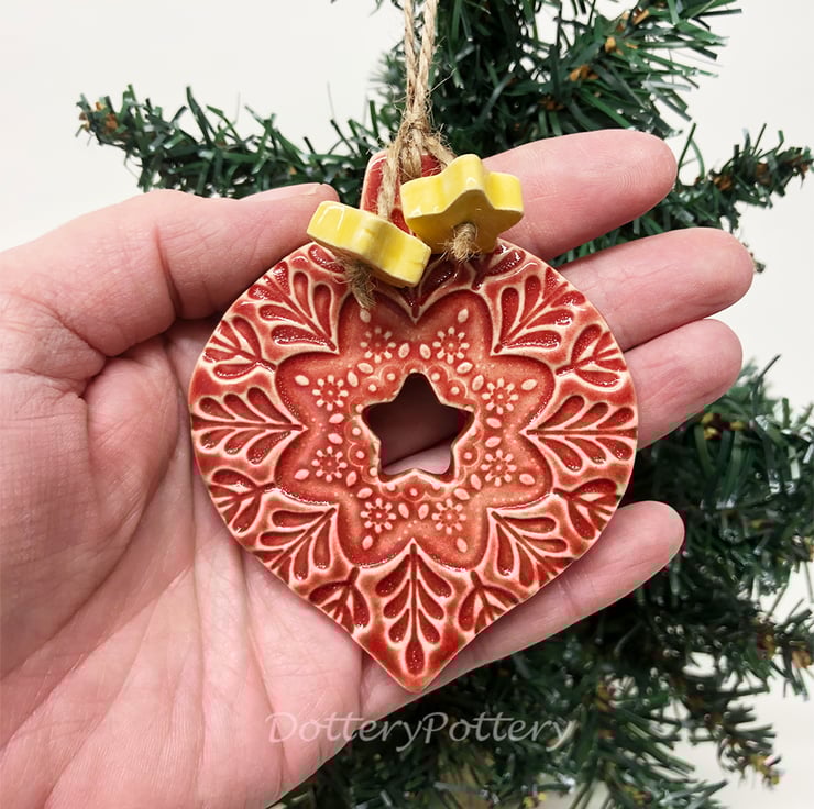 This ceramic bauble decoration has a lovely imprinted design and a cut out star to the middle. It is made from white earthenware clay and fired once, then glazed and fired again. Dangly stars hang from brown string. It measures 8cm length and 7cm width and 0.5cm deep.