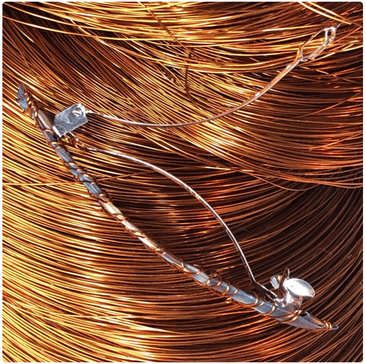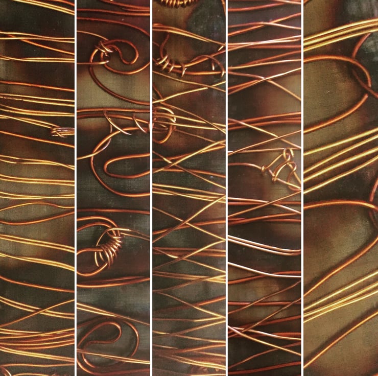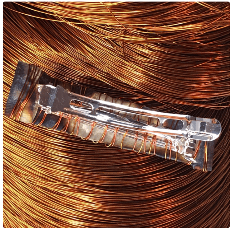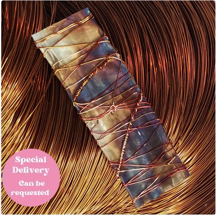 Wire wrapped stainless steel mesh hairclasp with large clasp with removable bar. The wire is repurposed from televisions or from electronics industry combined with stainless steel mesh coloured with flame.