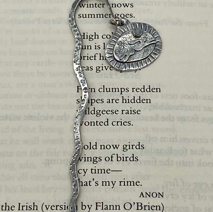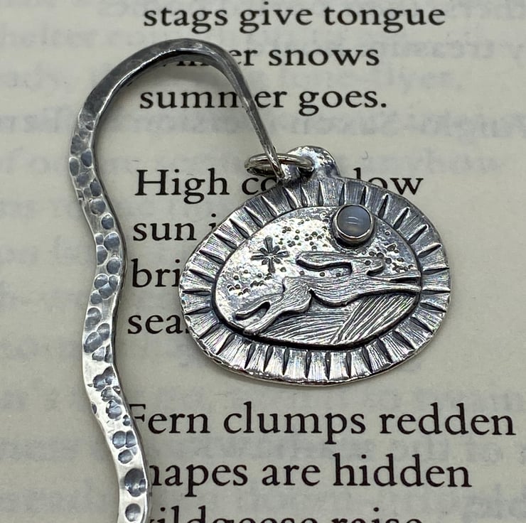 I make my bookmarks using traditional jewellery making techniques. A little hare bookmark set with moonstone cabochon. Sterling Silver with Oxidised finish.