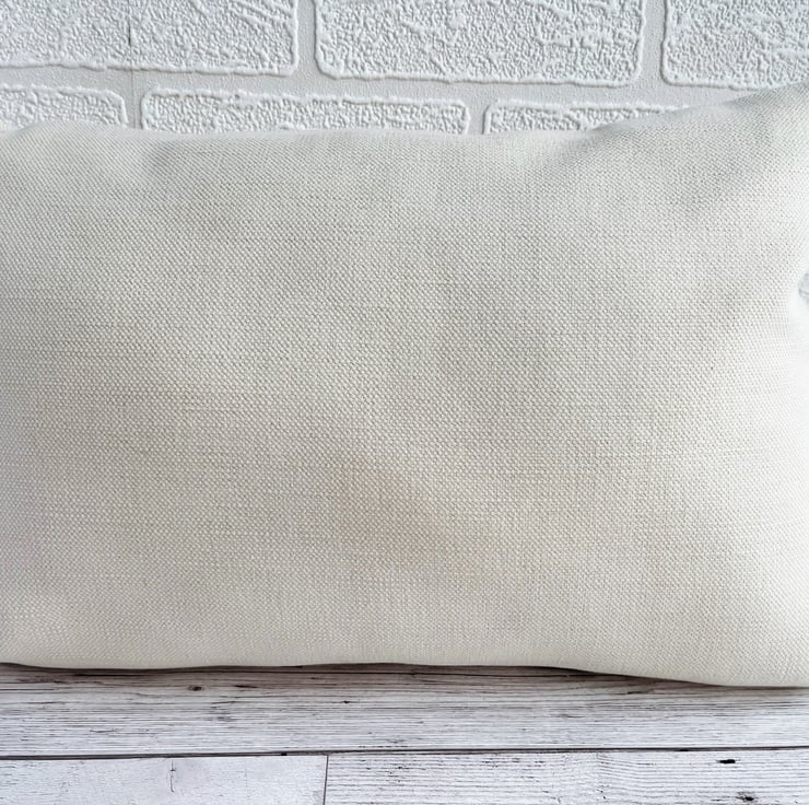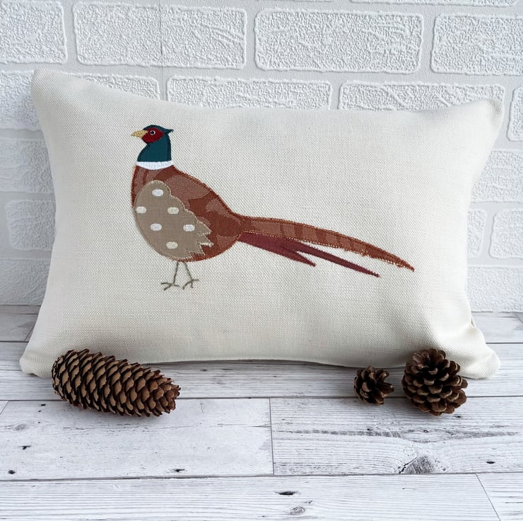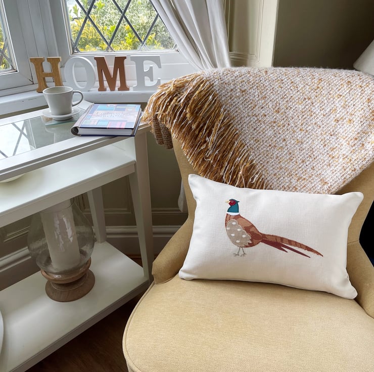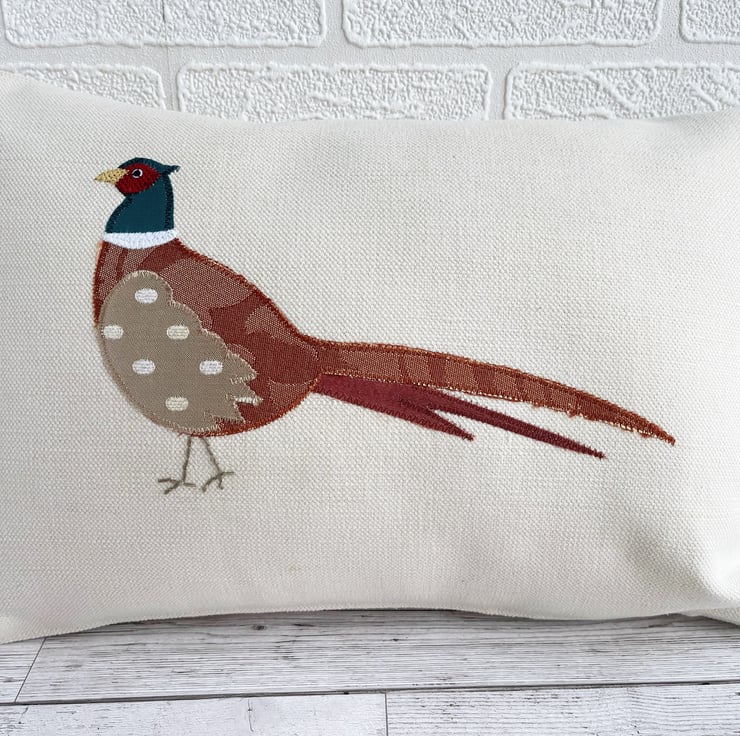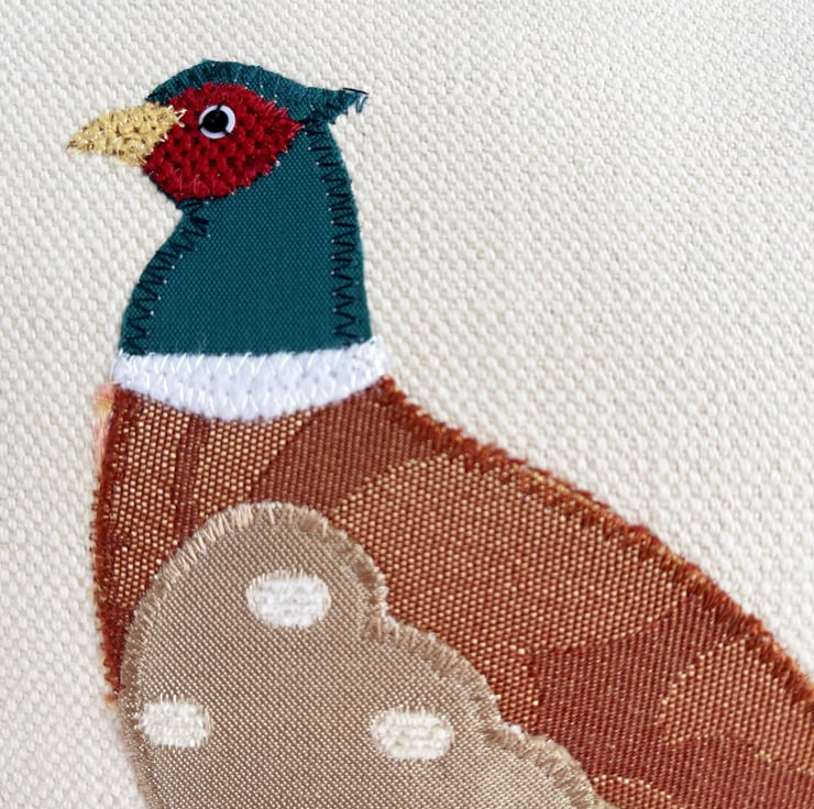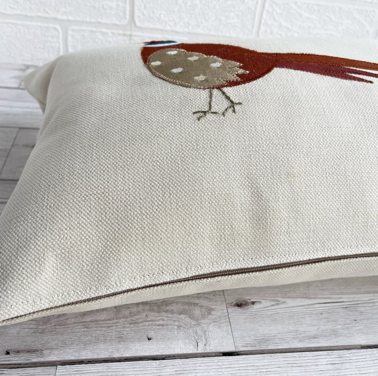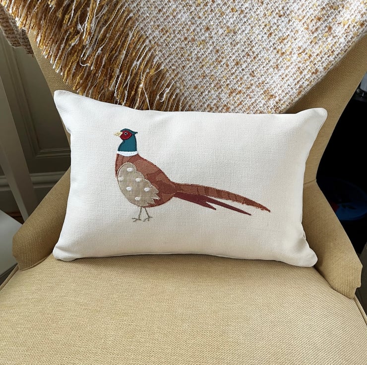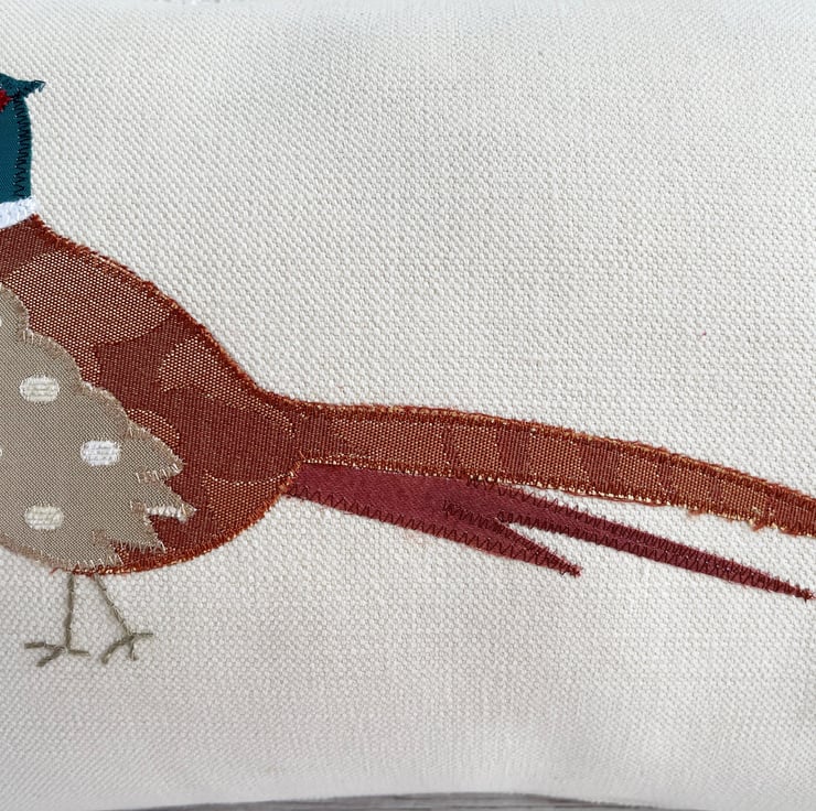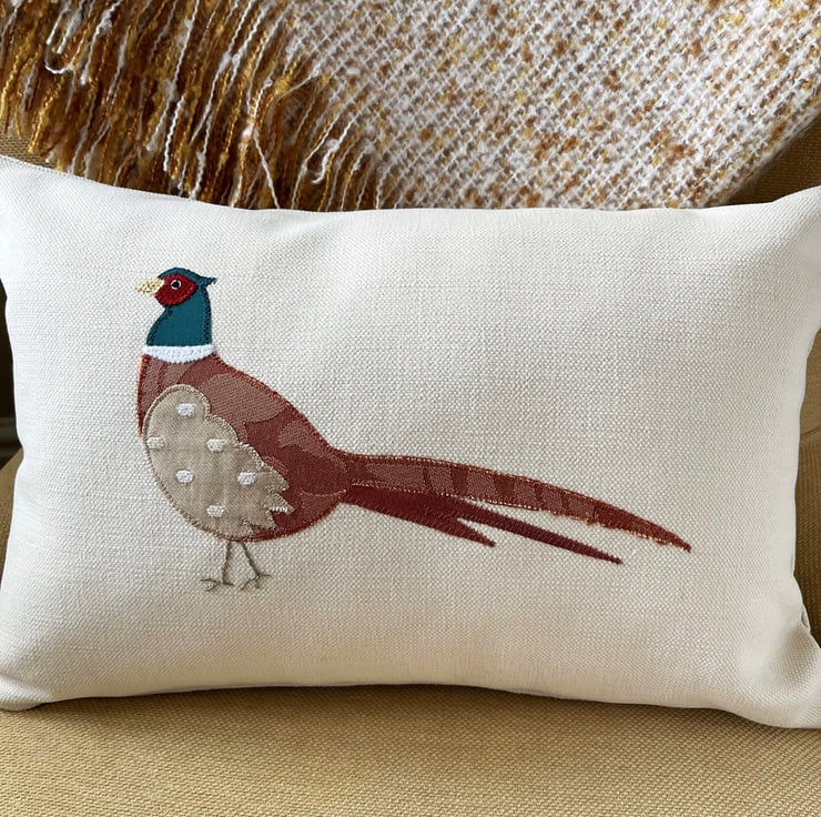 Pheasant cushion. A lovely rectangular cushion in cream fabric with an appliqué pheasant. This design was inspired by a trip to the North Yorkshire Moors where I saw lots of these lovely birds. The pheasant is made from a gorgeous russet patterned brocade fabric. His wing is made from gold fabric with a slight sheen and a raised pattern of white and cream textured spots. I’ve used teal and red fabrics for his head, along with a golden yellow beak and a strip of white felt for the white neck ring. For his eye, I’ve added a white sequin with a smaller black sequin on top. I’ve hand embroidered his legs in taupe thread. The cushion cover has a concealed zip along the bottom and comes with a polyester hollow fibre cushion pad, which conforms to safety regulations.