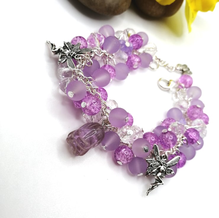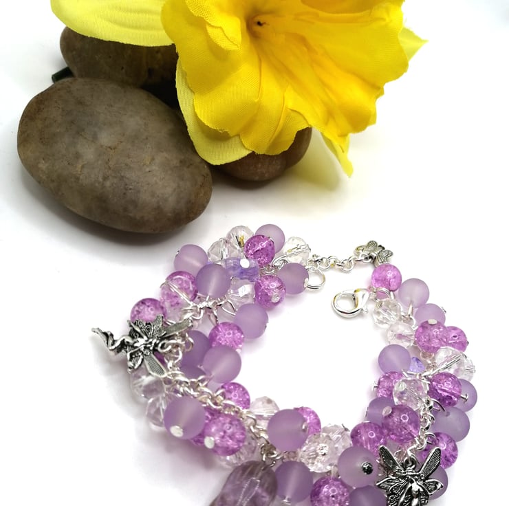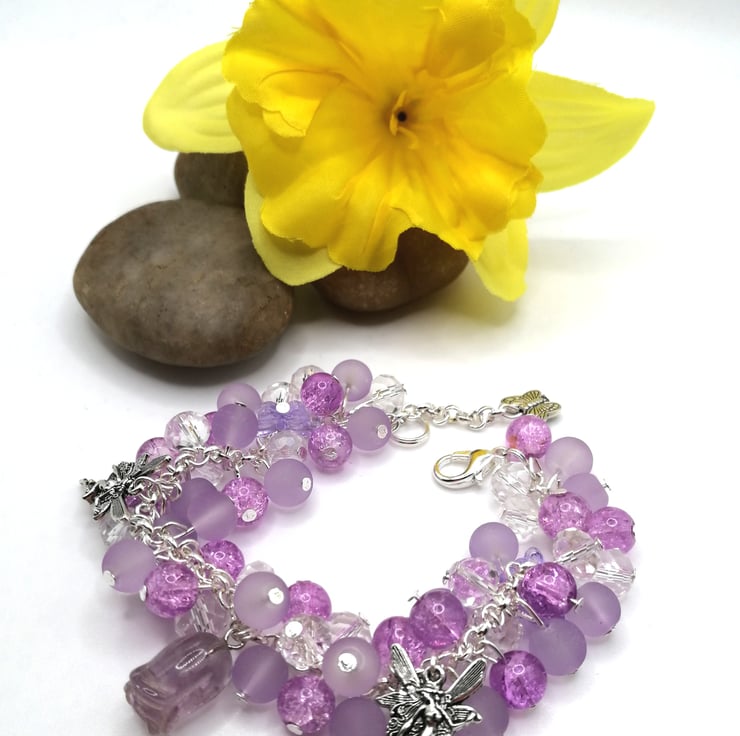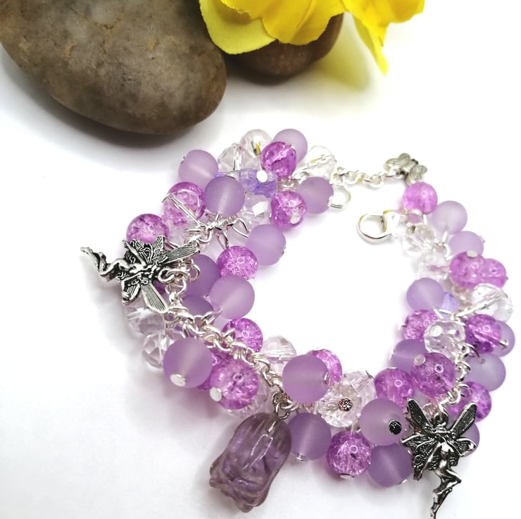 This pretty bracelet has been created using glass beads, silver plated charms and finished with a amethyst rose. If you know what length you would like this bracelet in please leave me a message. If I don't receive a message I will send as pictured.