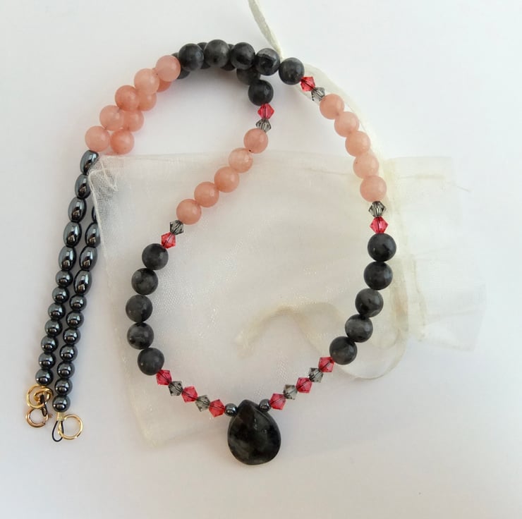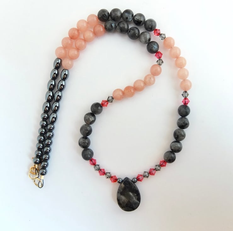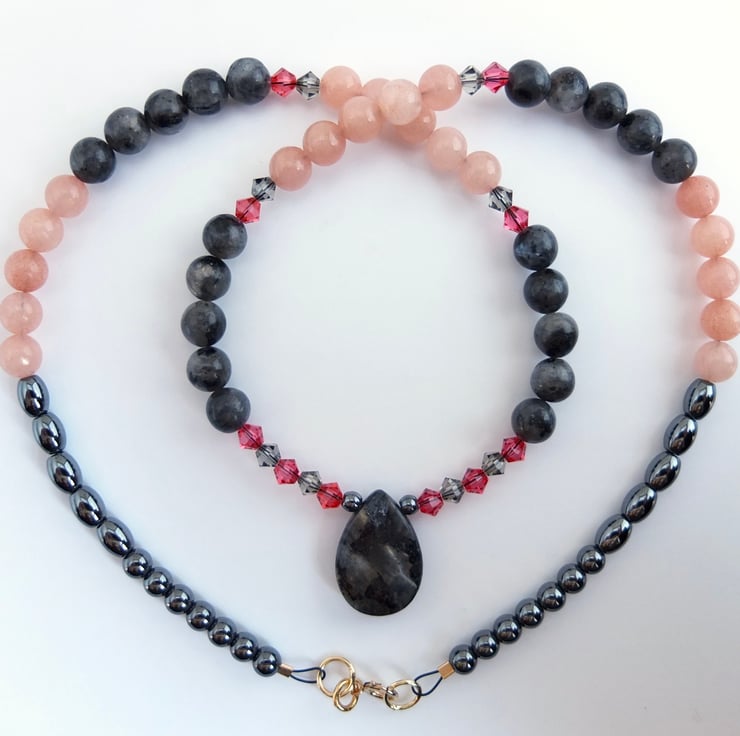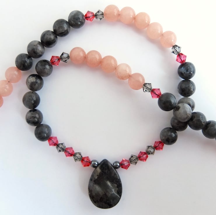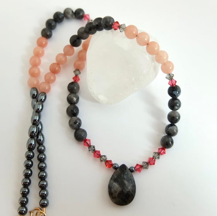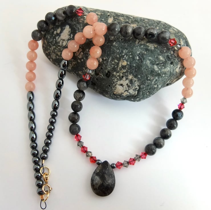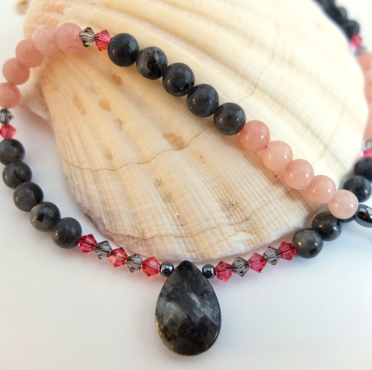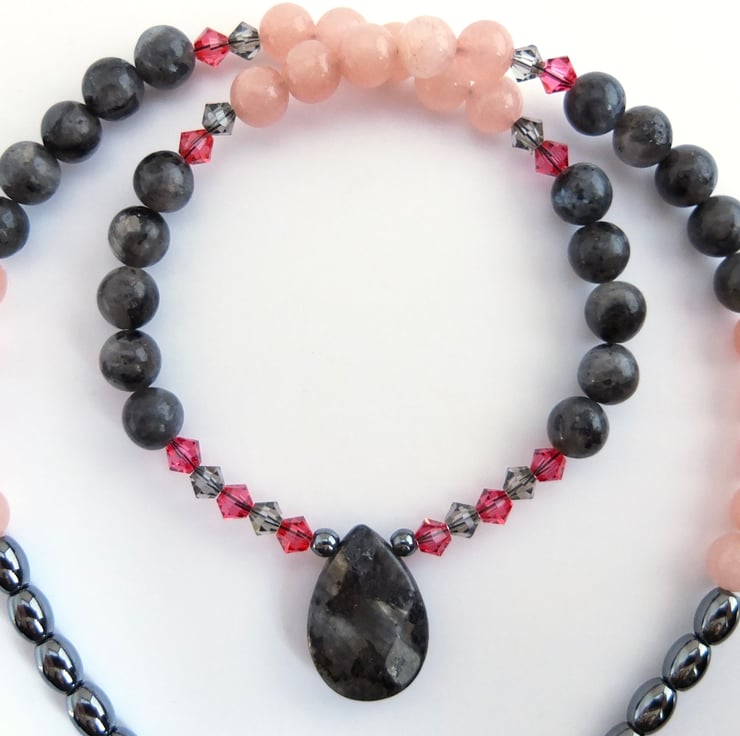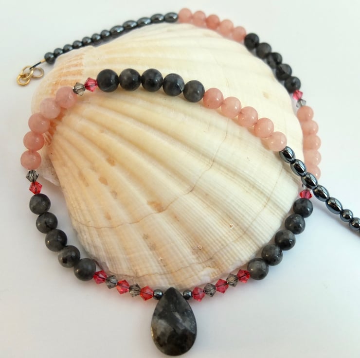 I have then used 6mm larvikite and pink opal beads, graduating to 5mm oval and 4mm round hematite beads and finishing with a gold filled trigger clasp..