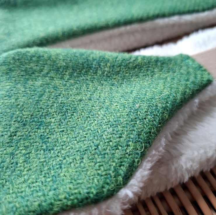 These cosy earwarmers are made from a beautiful grass green Harris Tweed and ivory thick fluffy fleece.