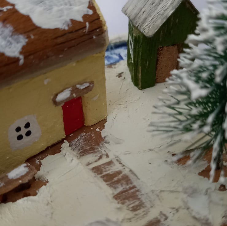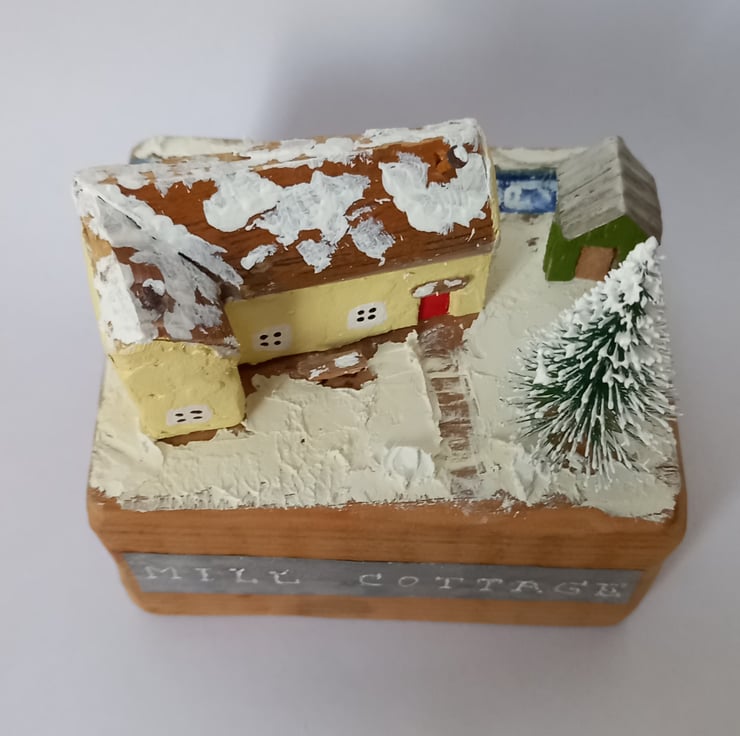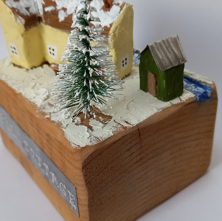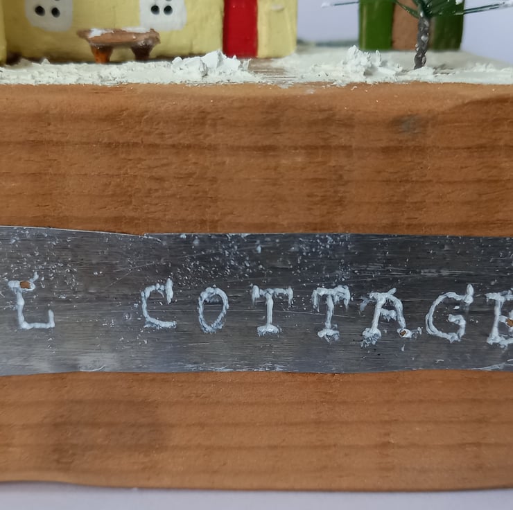 This little cottage is made from reclaimed wood and features white rendered cottage with rusty nail chimneys and red door. Also includes river flowing behind and green potting shed. The sign is made from old tin can and engraved.