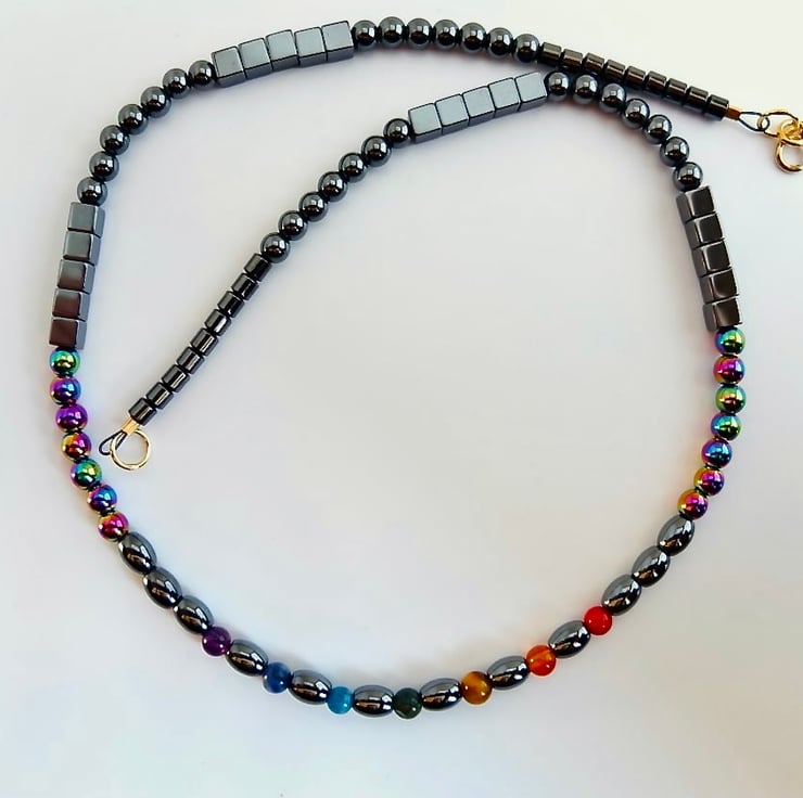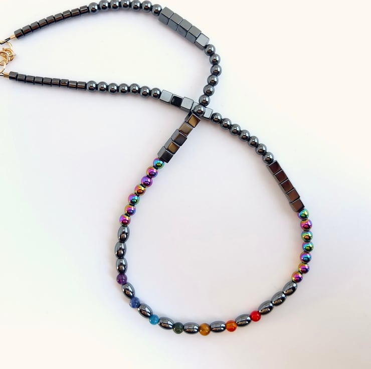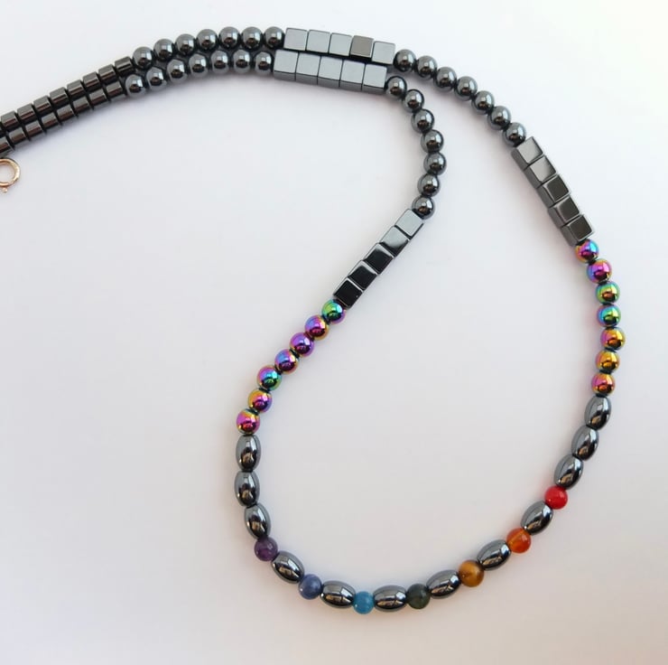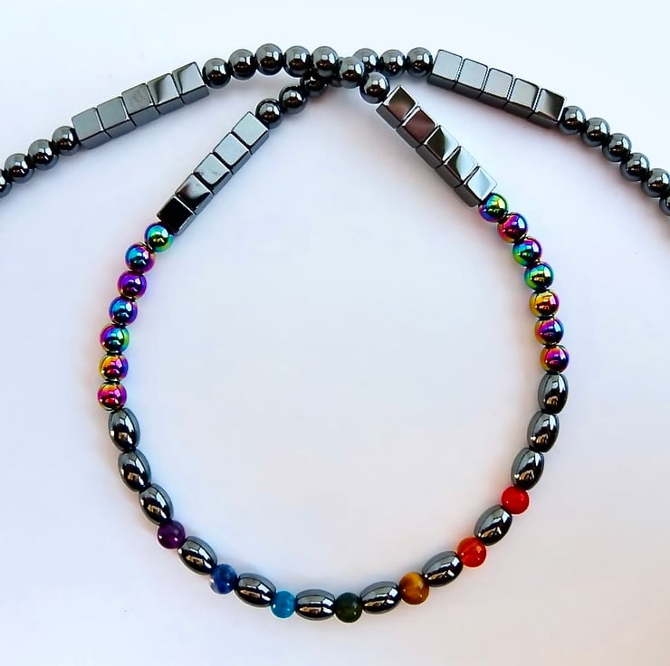 Seven semi-precious stones in the colours of the rainbow provide the focal point for this hematite necklace. The stones are separated by oval hematite beads and the theme is re-inforced by the addition of a row of rainbow hematite beads on either side. The necklace then graduates to hematite cubes, rounds and barrel-shaped beads.