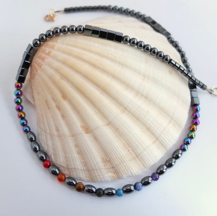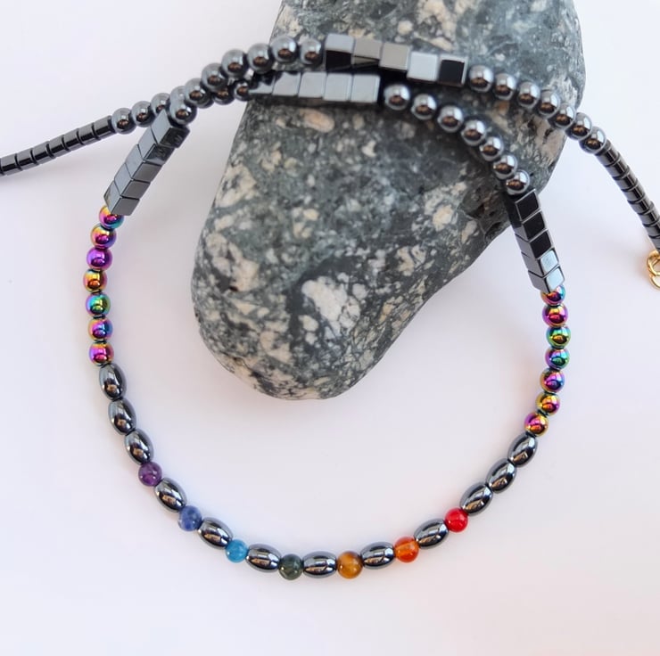 Haematite Necklace With Rainbow Of Semi-Precious Stones, Chakra Necklace