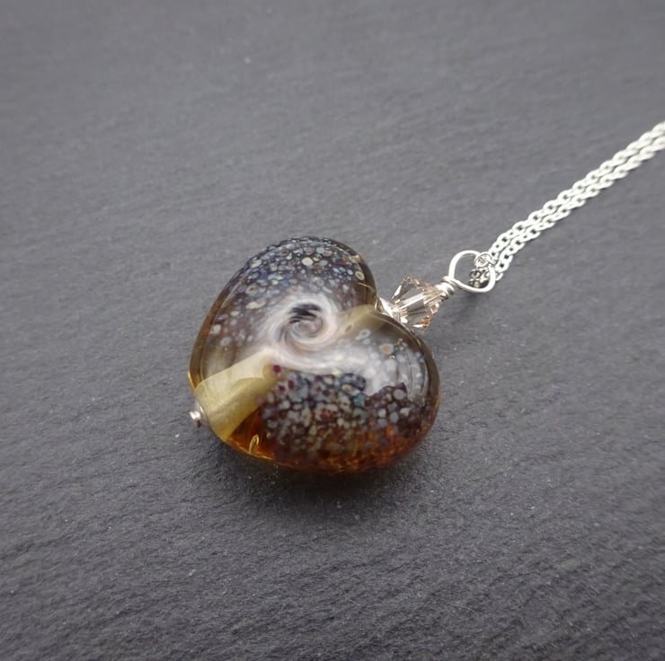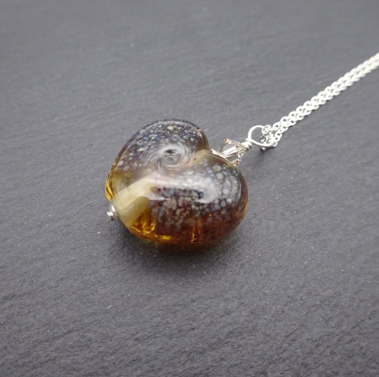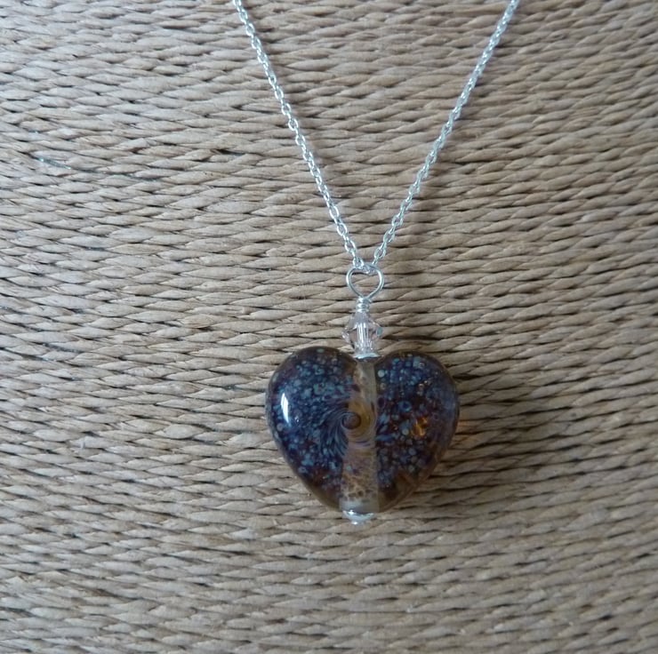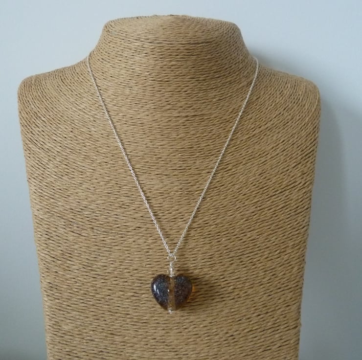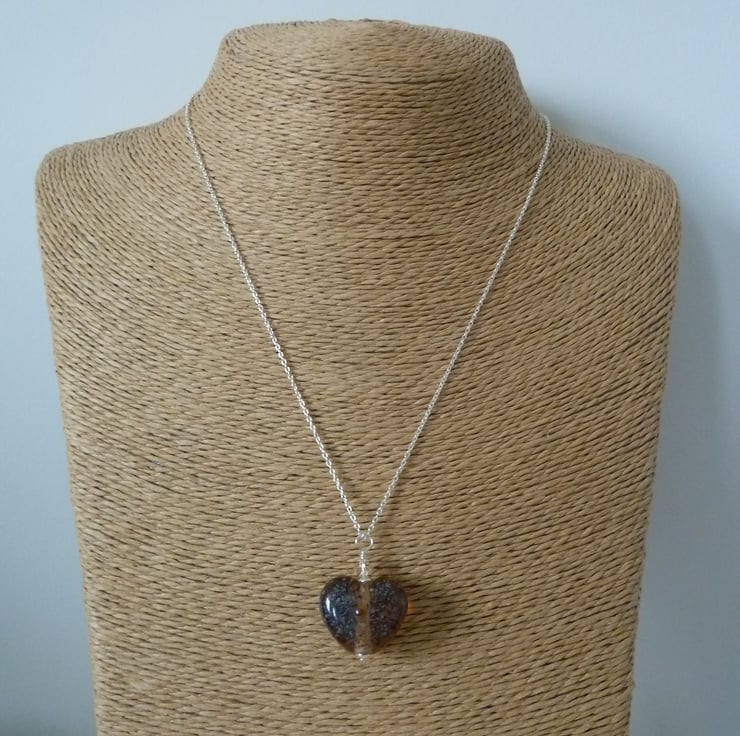 The heart has been handmade by me using pale brown glass with brown speckles.