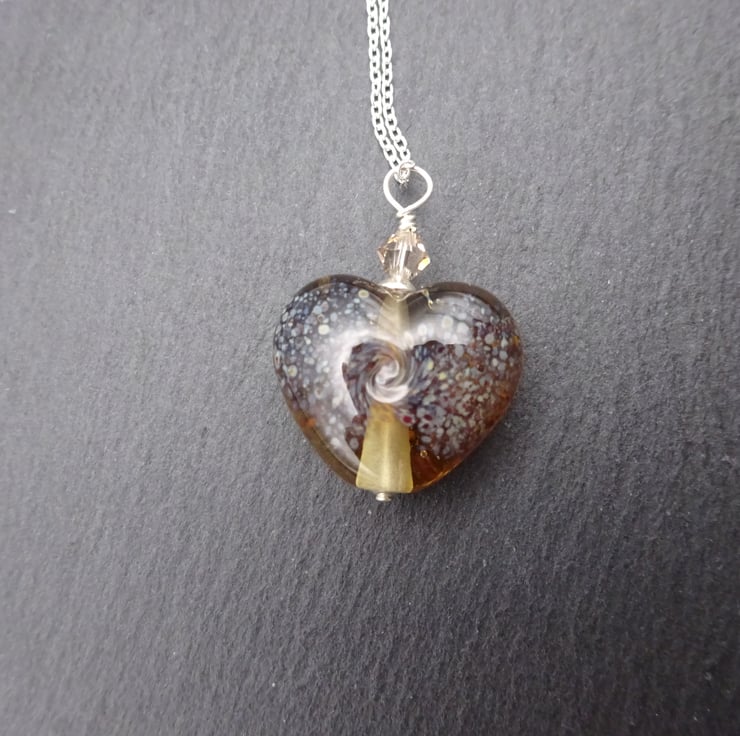 A sterling silver chain which has been strung with sterling silver beads, a pale brown swarovski crystal and a handmade lampwork glass heart pendant.