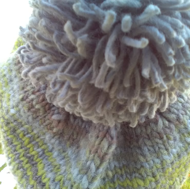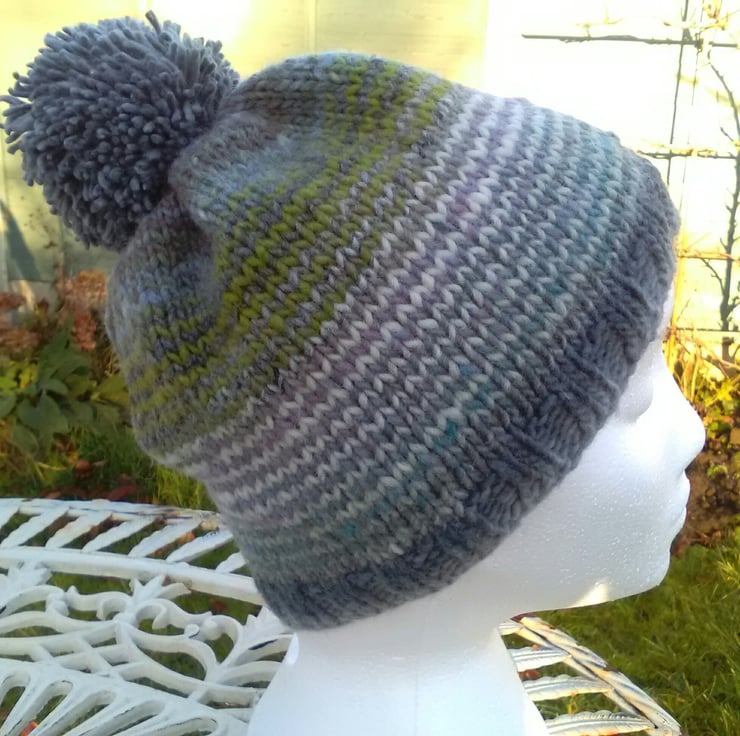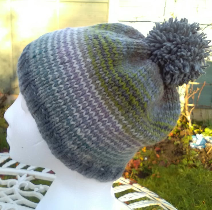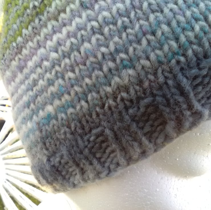 This colourwave has stripes of Sap Green, Blue, Lavender, Creamy palest Pink and Grey.The bands are continuous as the hat is knitted on the round with a single stripe pattern.