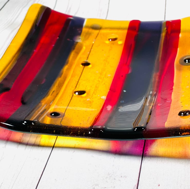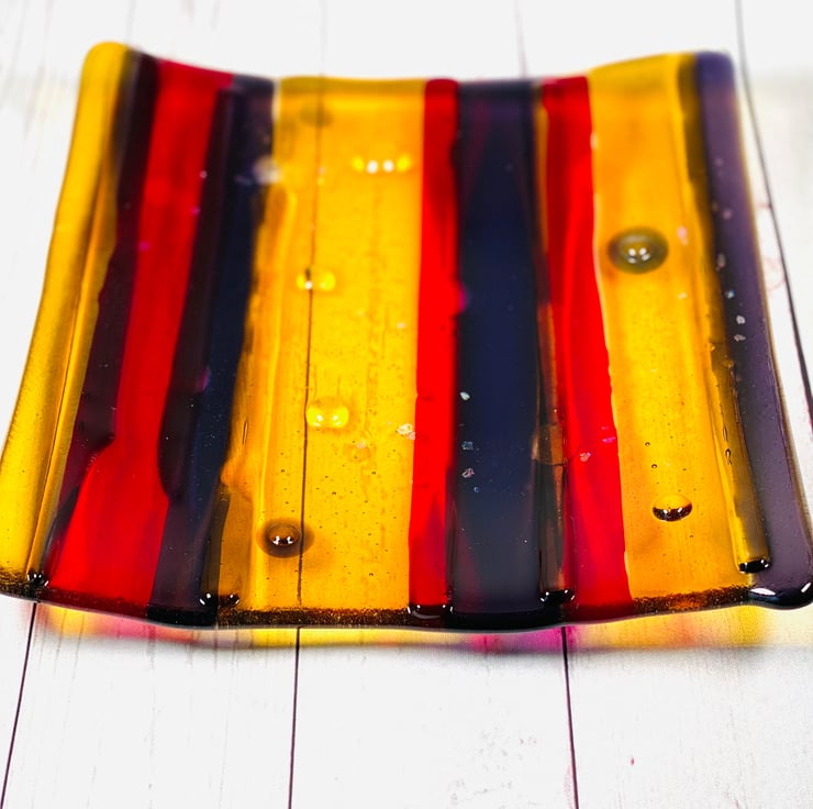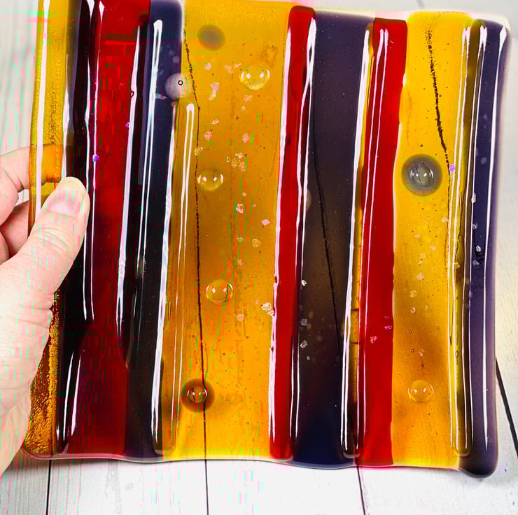 Gorgeous jewelled colours make this 8 inch square dish /plate very eye catching . A gentle curve gives this piece a contemporary look. Smooth with some contours . There is nothing wrong with the piece it was just a sample .