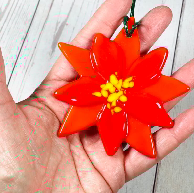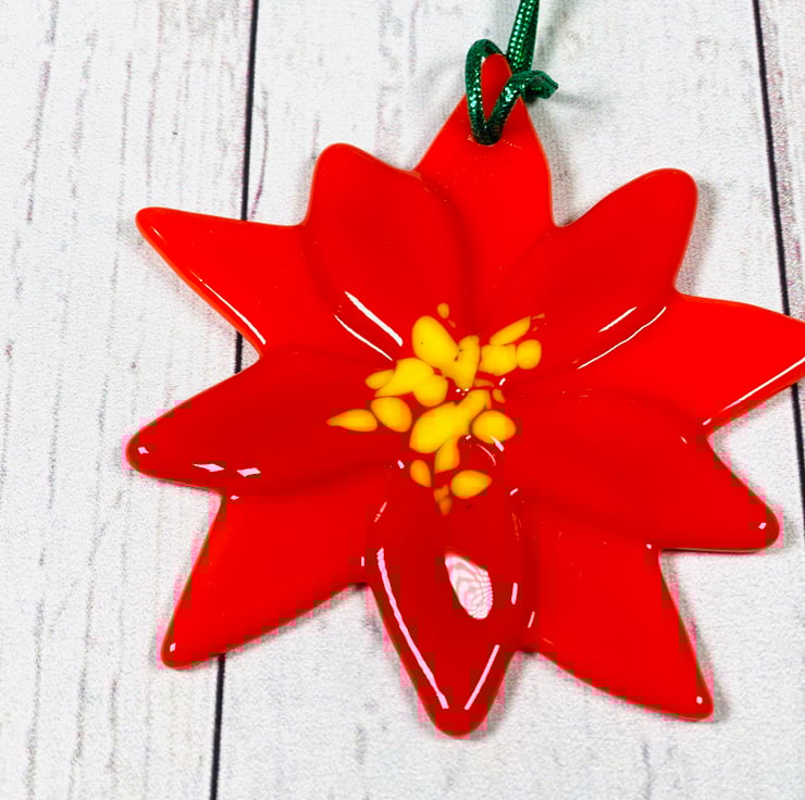A one off Christmas decoration poinsettia which is approximately 4 inches . Drilled and strung ready to hang . A pretty flower which was made slightly larger than my usual decorations