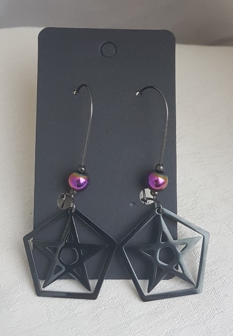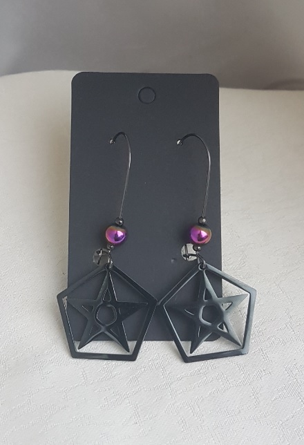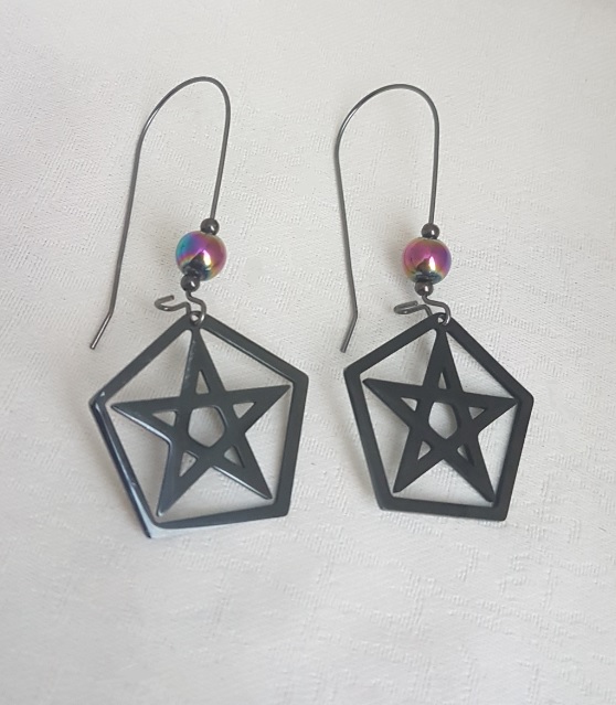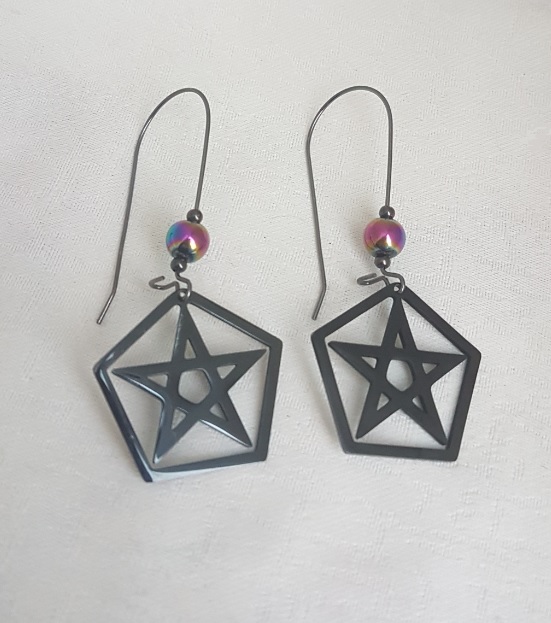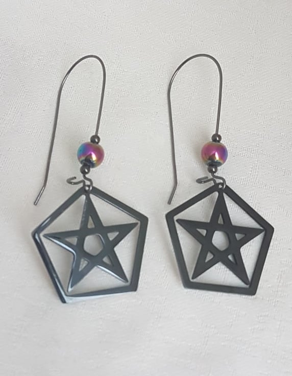 Earring length is approx 7.2cm long from top of the ear wire to the bottom of the pentagons. Pentagon pentacles are approx 3cm H x 3.2cm W and made from Dark tone metal alloy. Ear wires are long kidney shaped and dark tone approx 4.2cm long . Rainbow Haematite beads are 8mm and are fixed to the ear wire by crimps either side (covered by a bead).