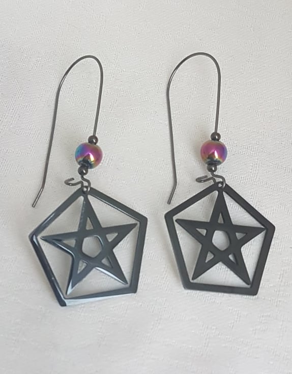 Dangly Pentagon Pentacle Earrings with Rainbow Haematite Beads.