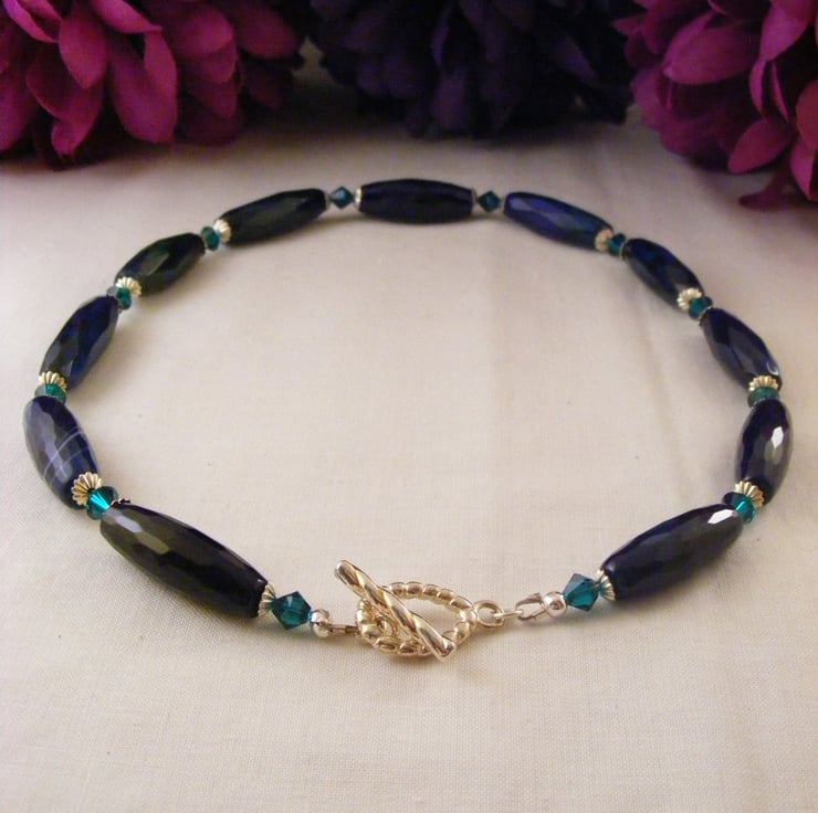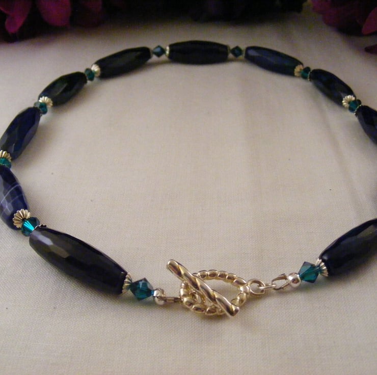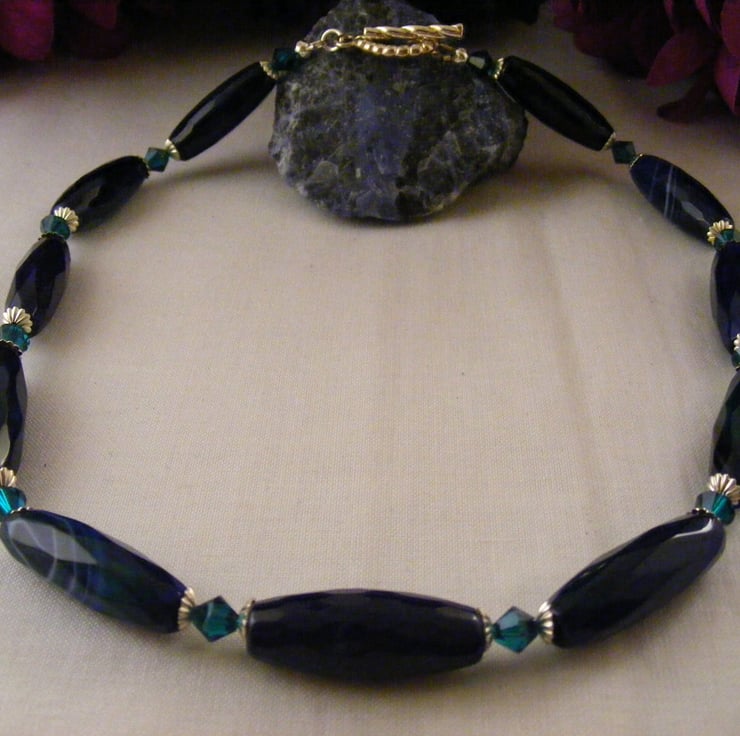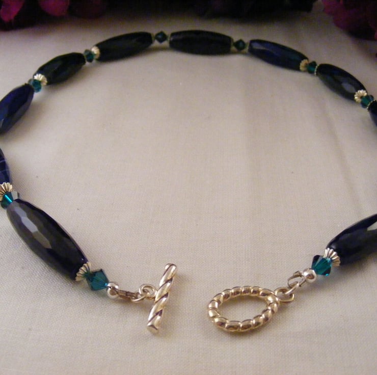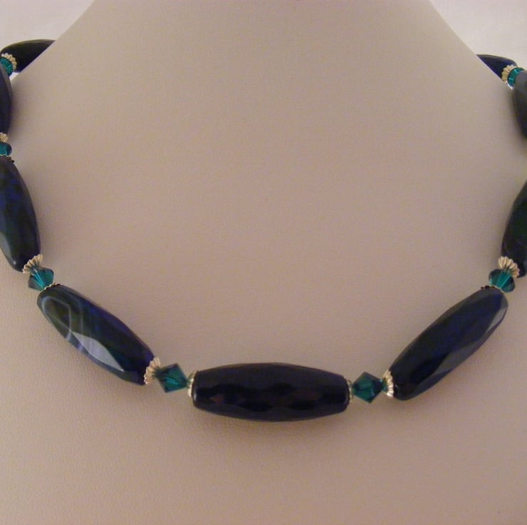 I've handmade this gemstone necklace by threading, 30 x 8 mm blue and green agate tube beads onto beading wire with, 6 mm emerald Swarovski crystals and 5 mm silver plated fluted bead caps. Wire ends are finished with silver plated findings. Clasp is a silver plated toggle.