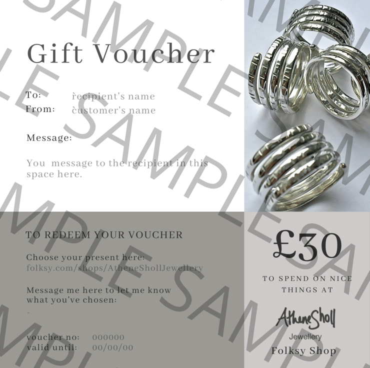 This voucher can be used on any item in our Folksy shop. We can email the voucher to you to print at home or we can email it directly to the recipient. Just let us know what email to send to, the name of the recipient and your name in the note to buyer section when you order.