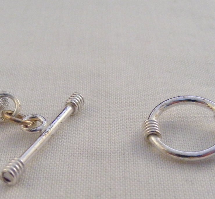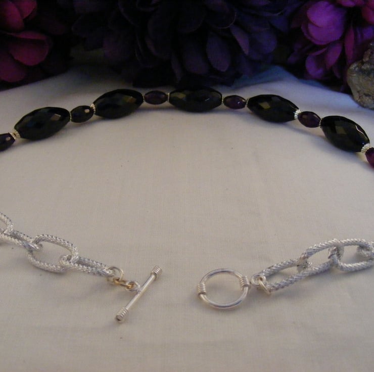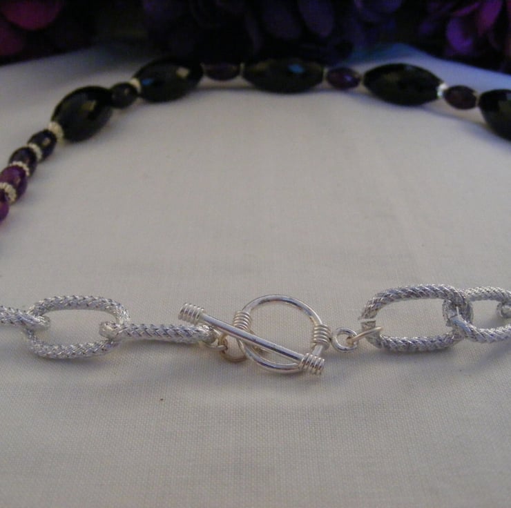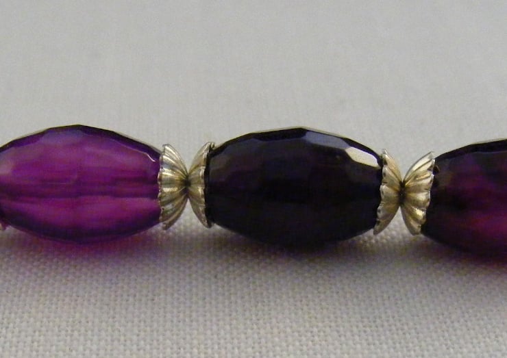 10 x 5 mm purple faceted agate rice beads and 5 mm silver plated bead caps. Beads and bead caps are threaded onto beading wire. Ends of the wire are finished with silver plated findings. 18 x 12 mm silver plated oval link chain and a silver plated round toggle clasp are attached to complete the necklace.