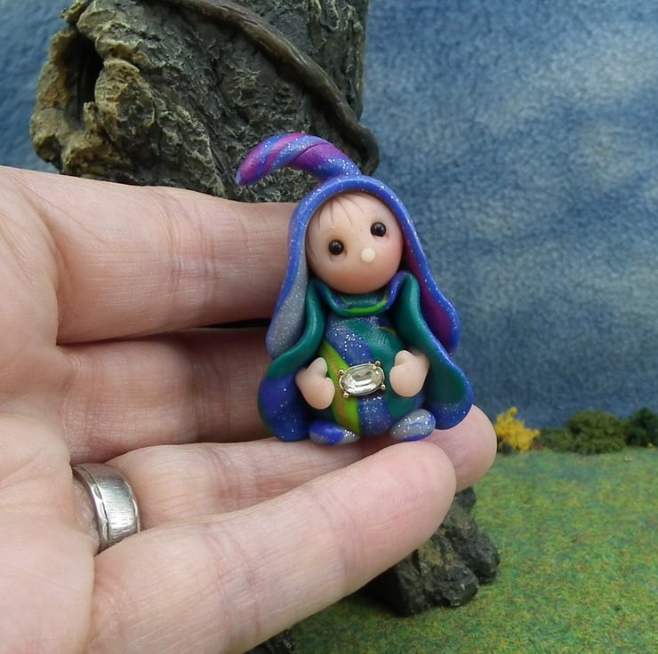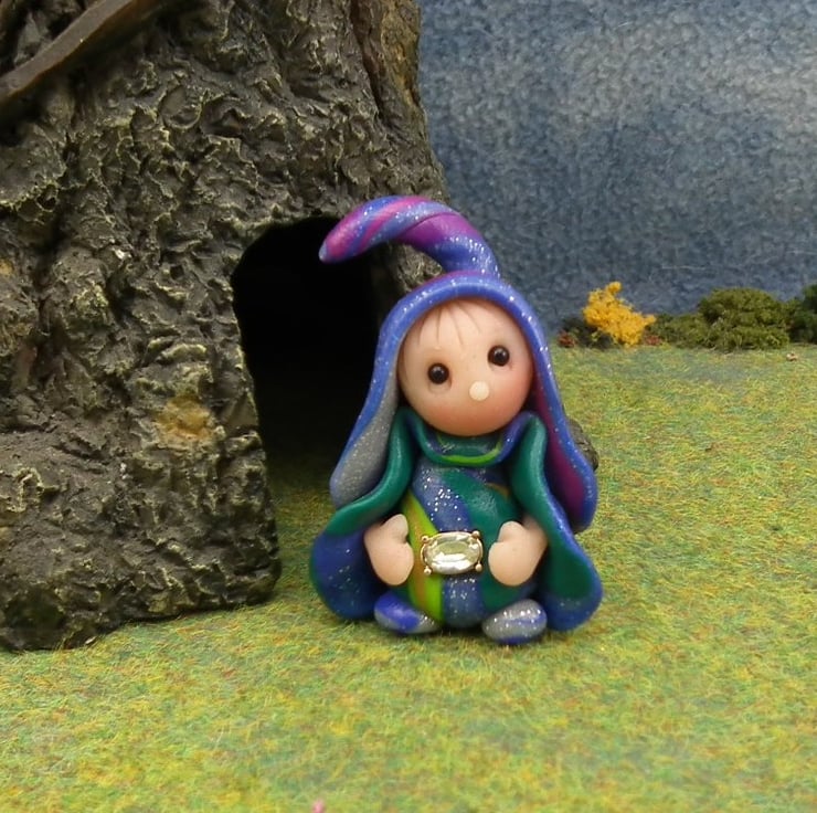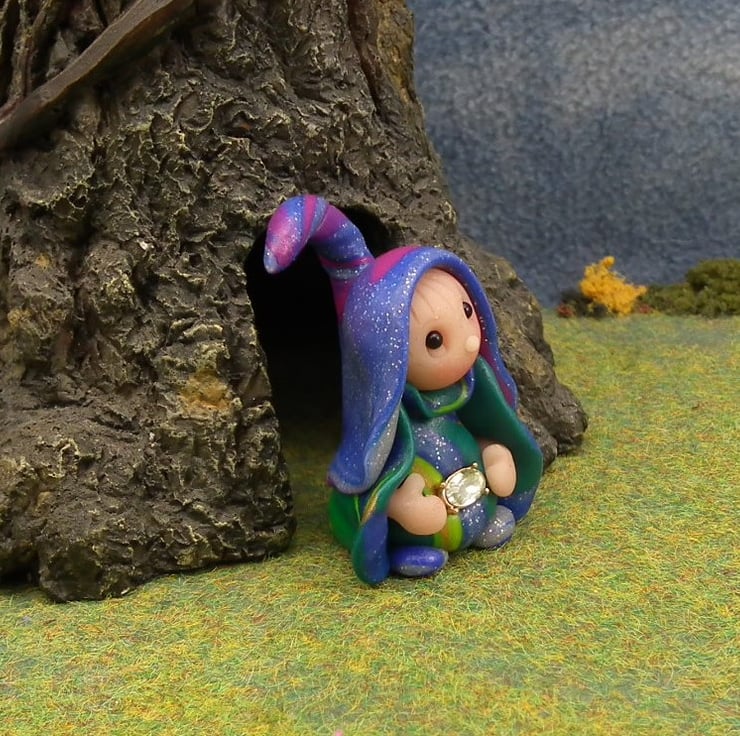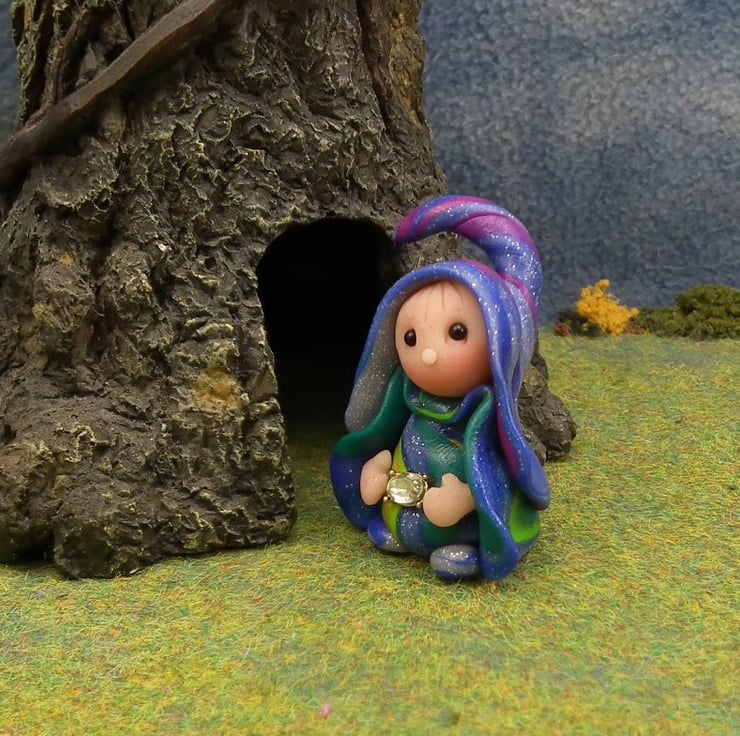 This is a 'one of a kind' creation having been entirely handmade without the use of moulds here at my studio on the Sussex Coast. Modelled with artist blend polymers, blushed before sealing with lacquer, Uno has sparkling black onyx eyes and variegated robes. Uno the Magical Gnome is just one and a half inches tall.