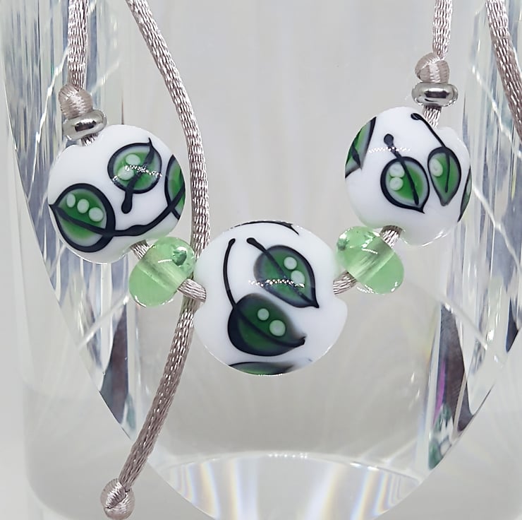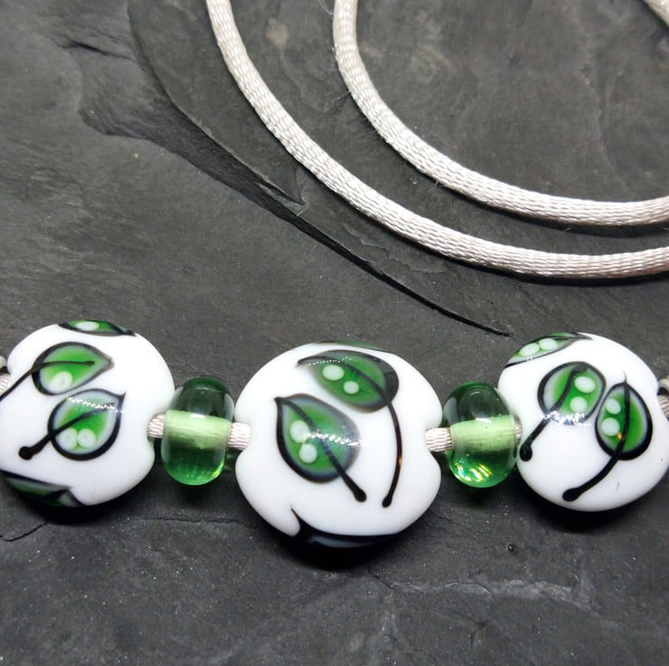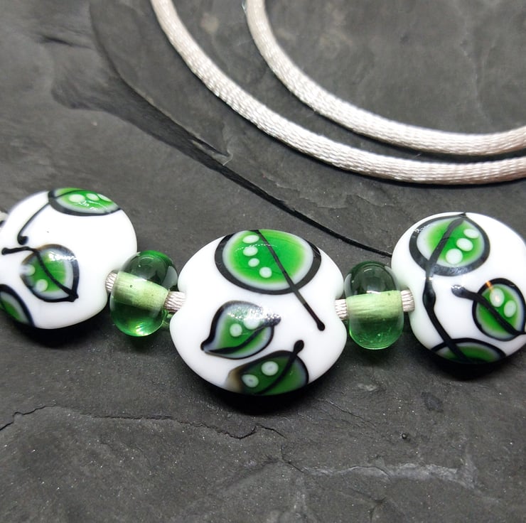 A trio of handmade glass lentil beads decorated with falling leaves, they measure between 14mm and 19mm across and have been complimented with transparent apple green spacer beads and stainless steel slider beads.