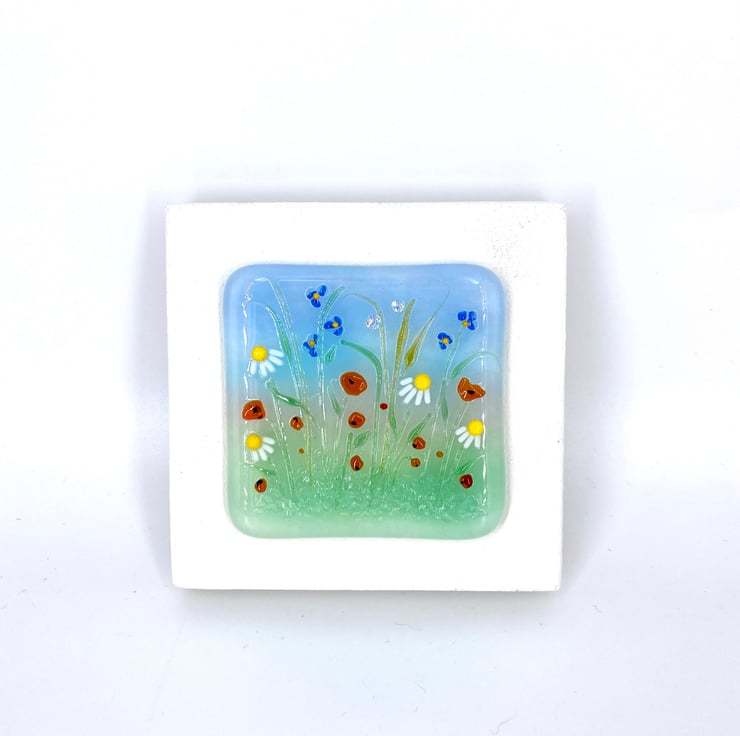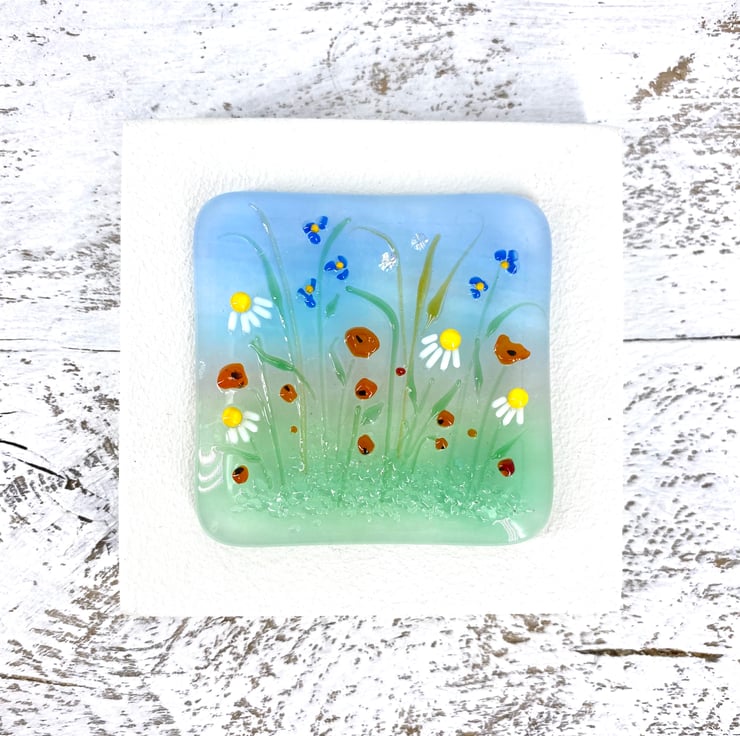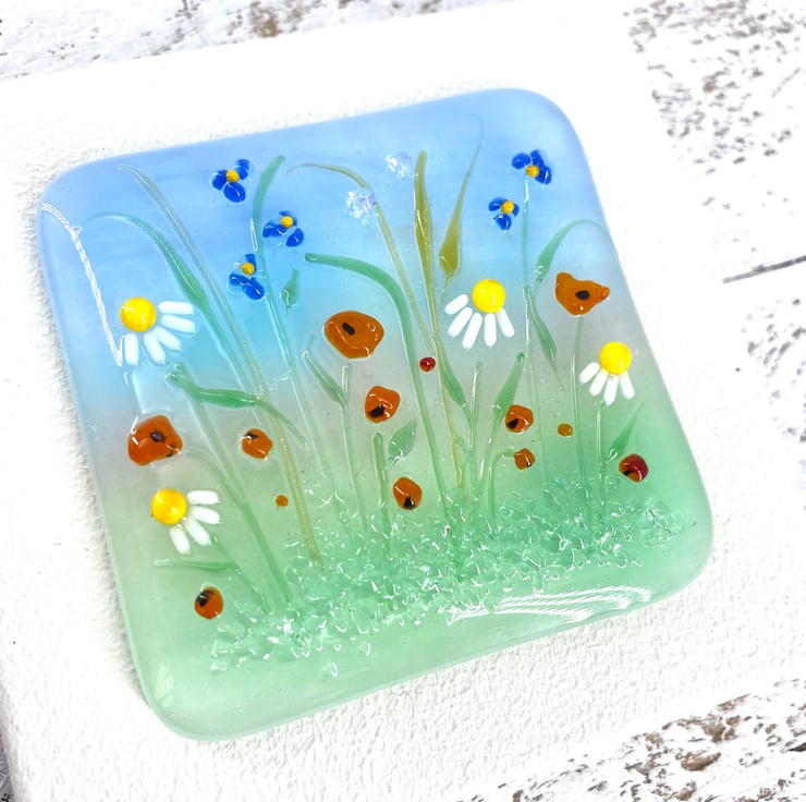 A gorgeous mix of wild flowers, including poppies and daisies with sparkly dichroic glass detail which catches the light beautifully.