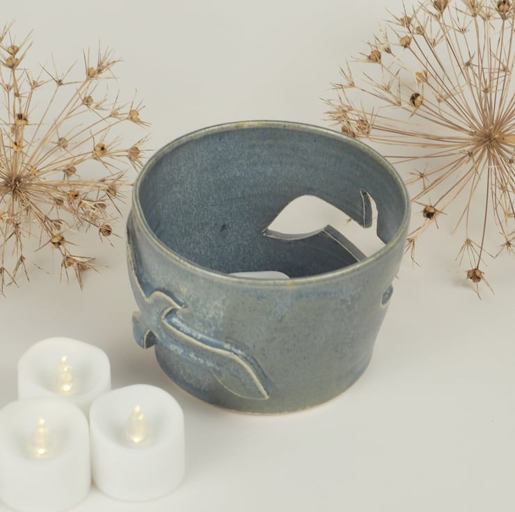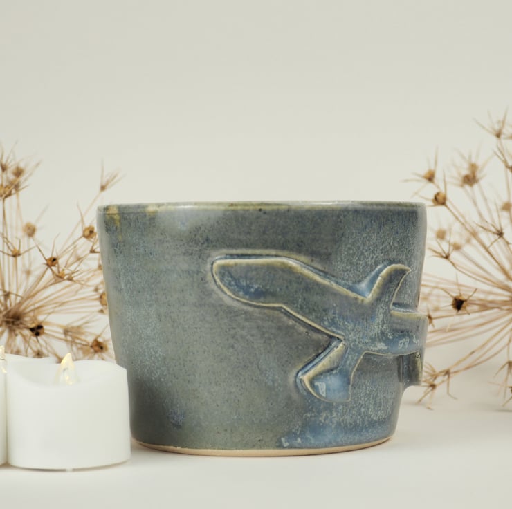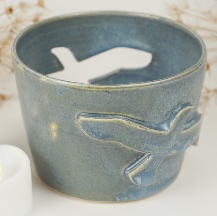 A grey blue blue ceramic candle holder with a single hand carved seagull cut-out on one side and a raised seagull on the other.