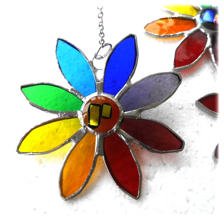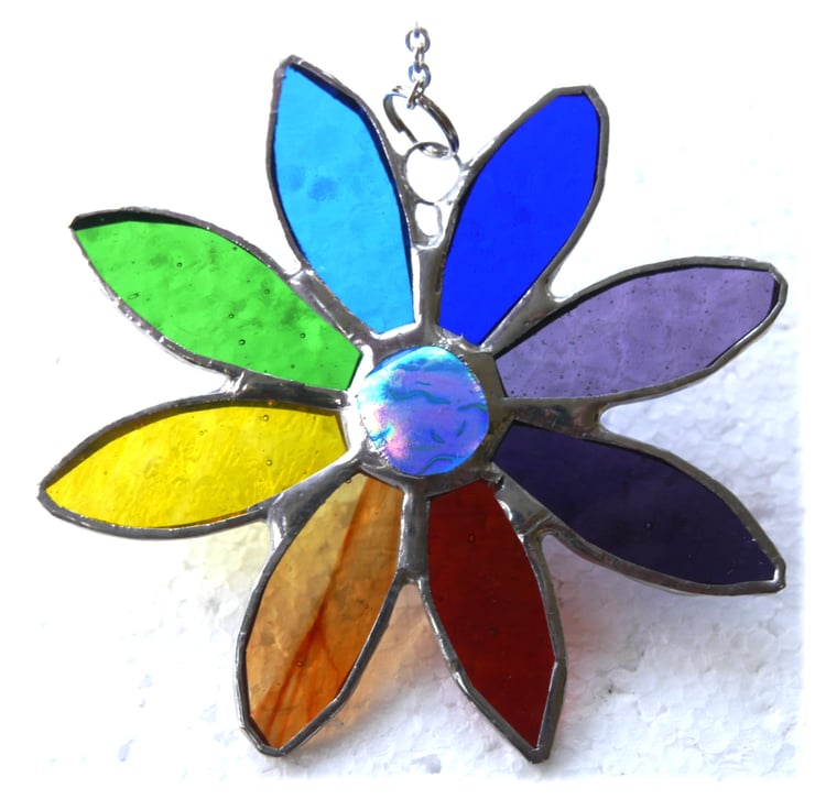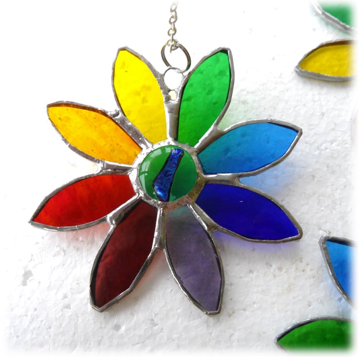 This daisy has 8 different coloured petals, lots of lovely textures in the glass, a rainbow array and is beautifully bright.