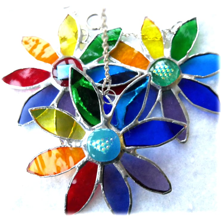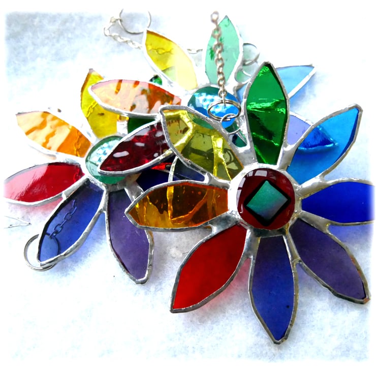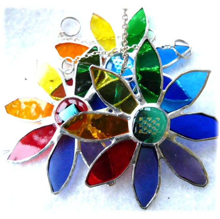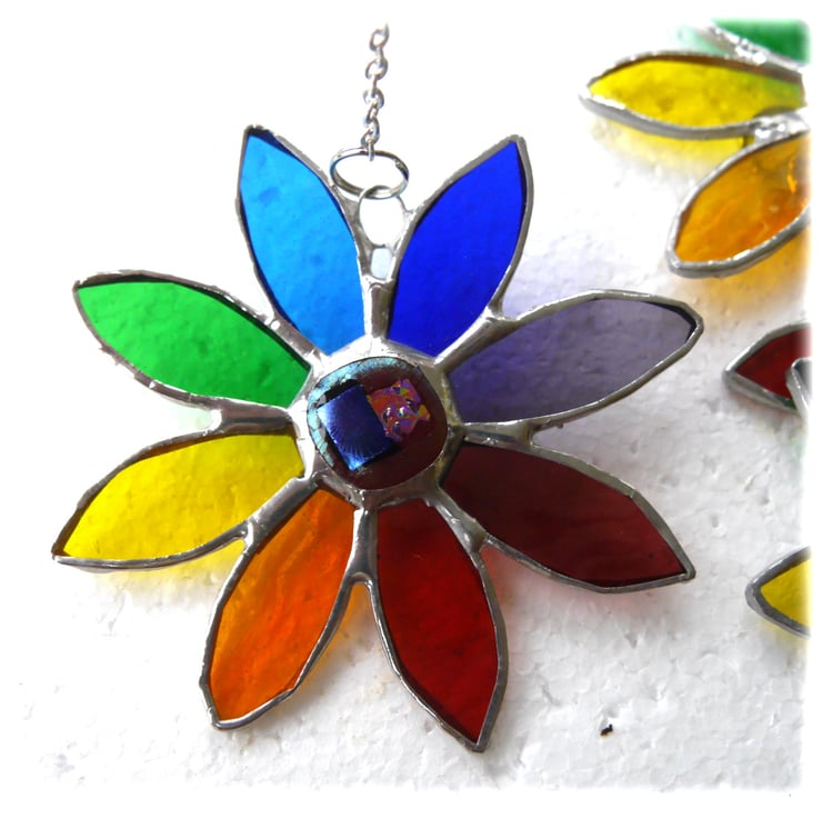 A variation of my other daisies but this one in rainbow shades with an extra special centre, a pretty glass nugget which I fused in my kiln with dichroic glass added for super sparkle.
