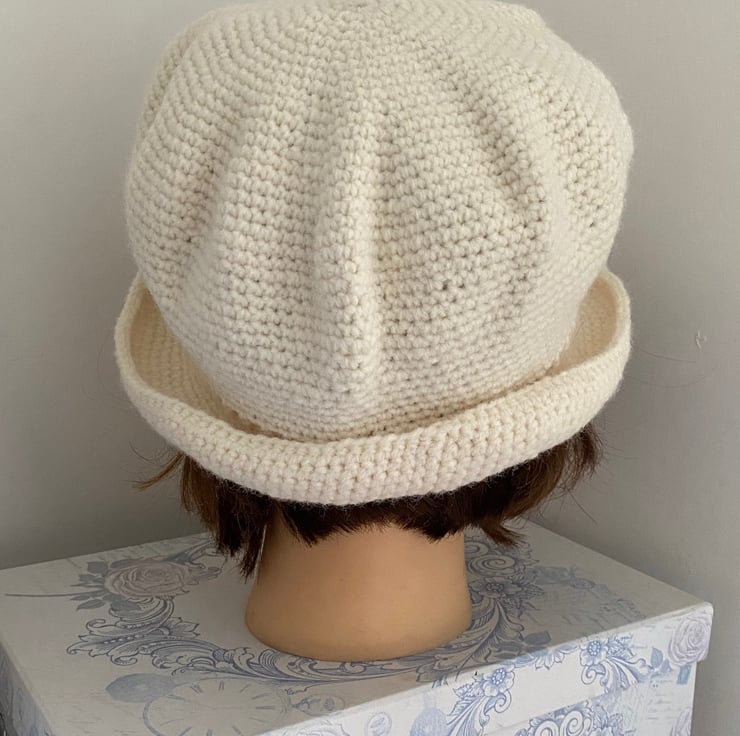 Reminiscent of hats worn in the Downton era, this cloche has a bell shaped crown with a 2" brim which can be worn turned back or lowered as shown in the images.