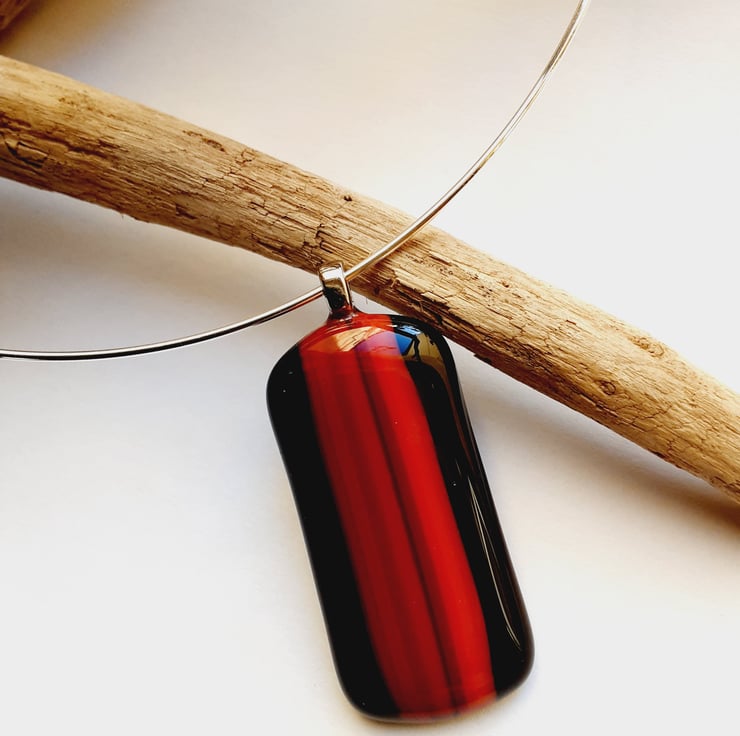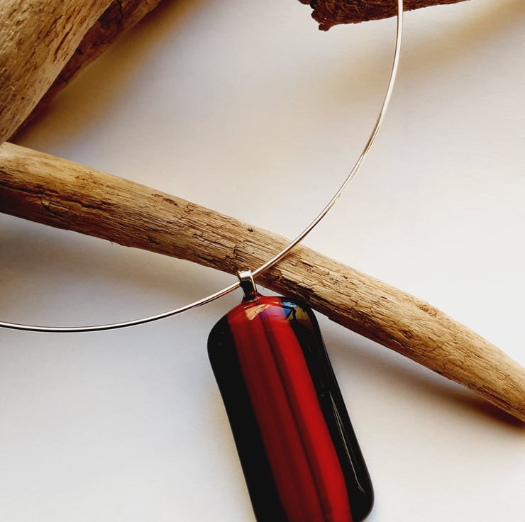 A beautifully simple pendant on a 18" silver plated neckwire. This features a hook clasp and threaded ball stopper which can be unscrewed to remove the pendant if required. The pendant is handmade by me fusing black Bullseye glass as a background with an overlay of red toned stripes.