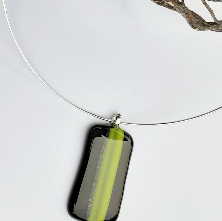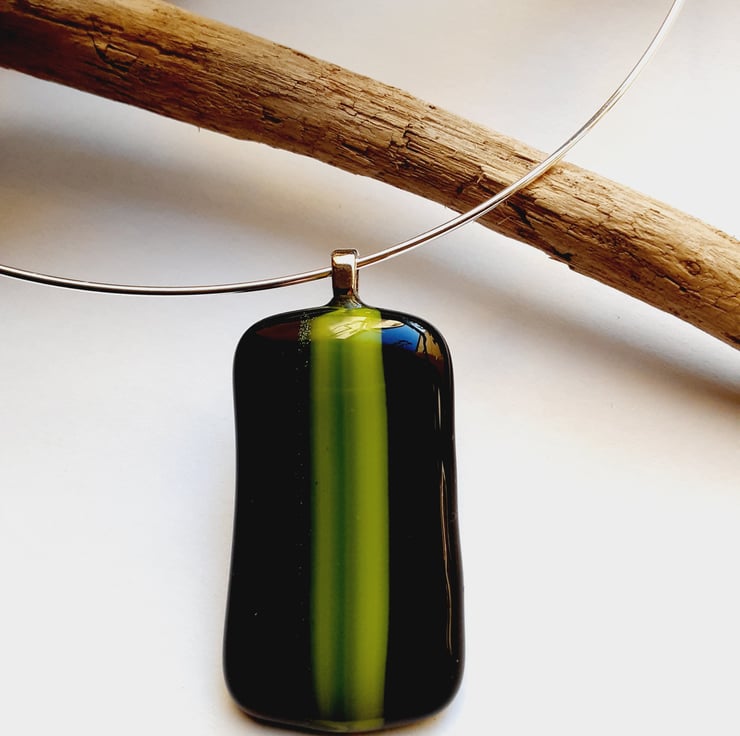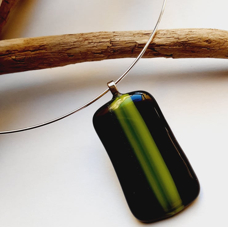 A beautifully simple pendant on a 18" silver plated neckwire. This features a hook clasp and threaded ball stopper which can be unscrewed to remove the pendant if required. The pendant is handmade by me fusing black Bullseye glass as a background with an overlay of green toned stripes.