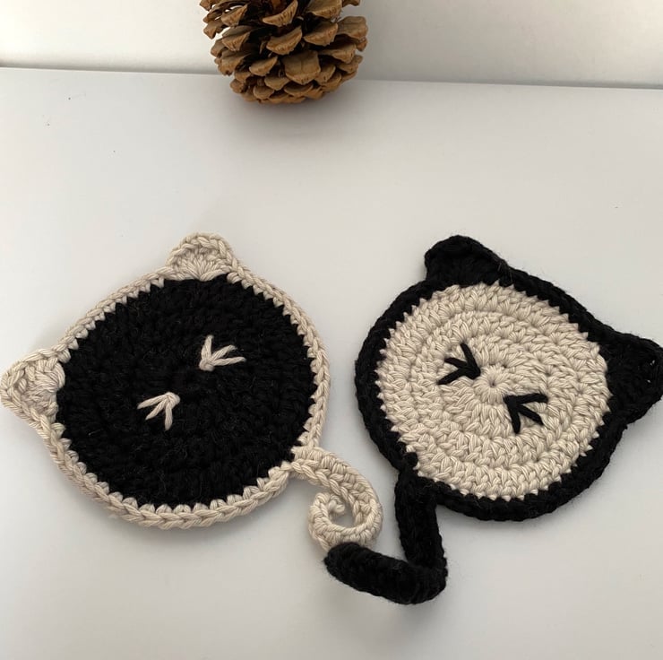 Hand crocheted by hand in organic 100% cotton, these coasters are washable for continuous use. Colours are Main Black with Pale Grey ears and tail (left), and Pale Grey with Black ears and tail (right).