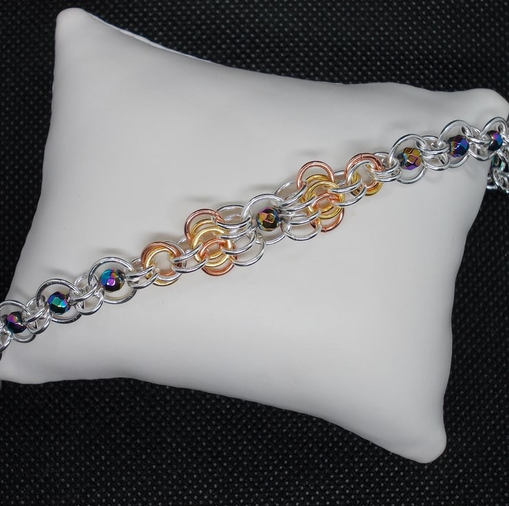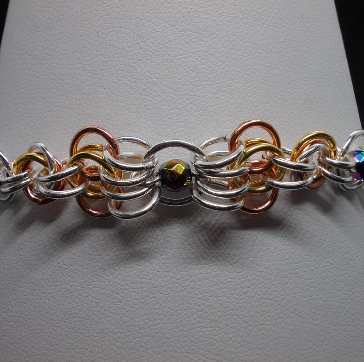 This 7 inch bracelet, not including the extender chain, features a butterfly chainmaille weave at the centre with a multi colour haematite bead. The bracelet is made using chainmaille components that also include haematite beads.
