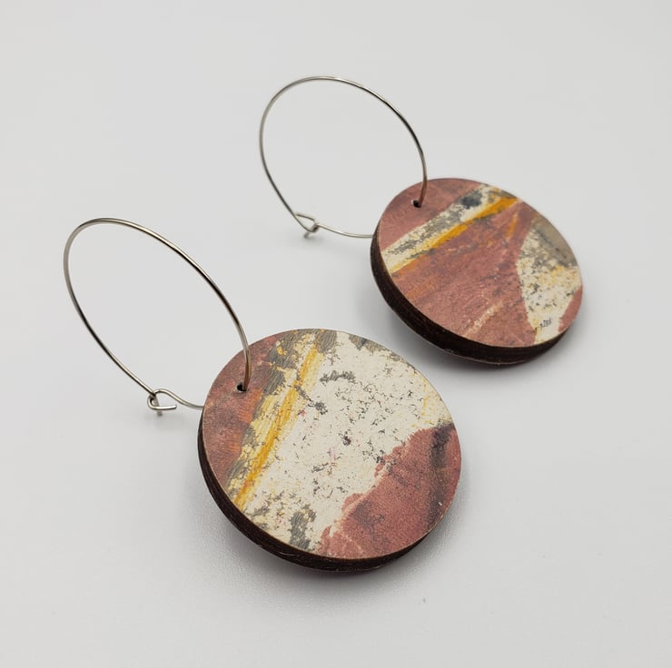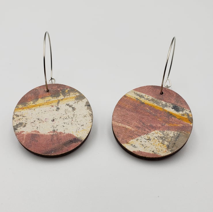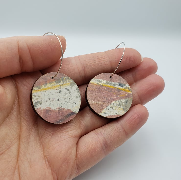 Very sweet dangly earrings in gorgeous pink, white, grey and yellow. The design was hand printed by me then varnished on top. Perfect summery earrings.