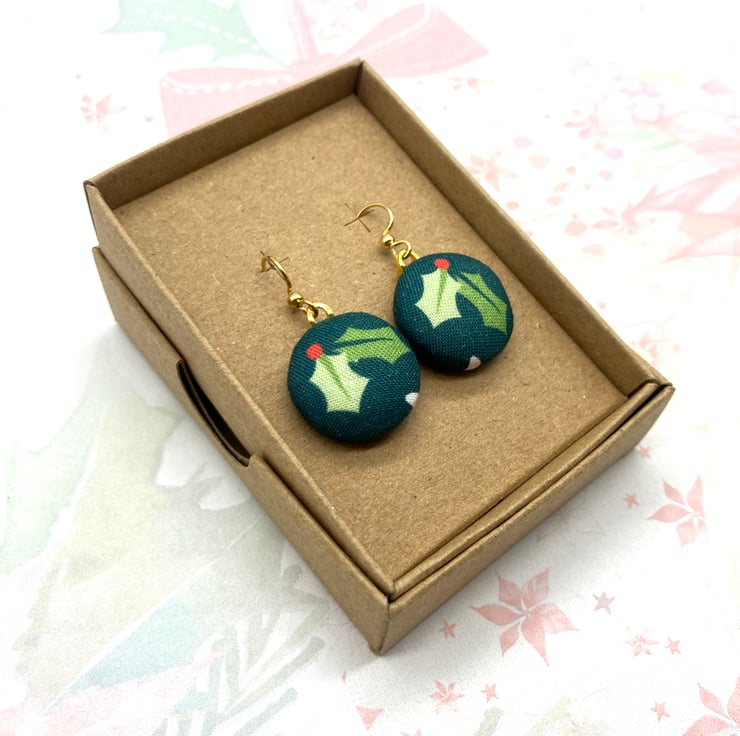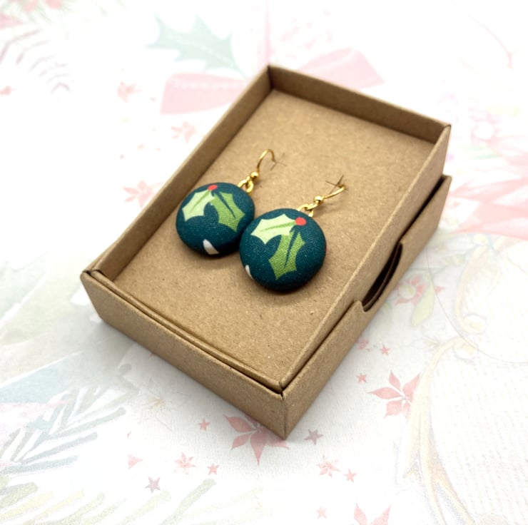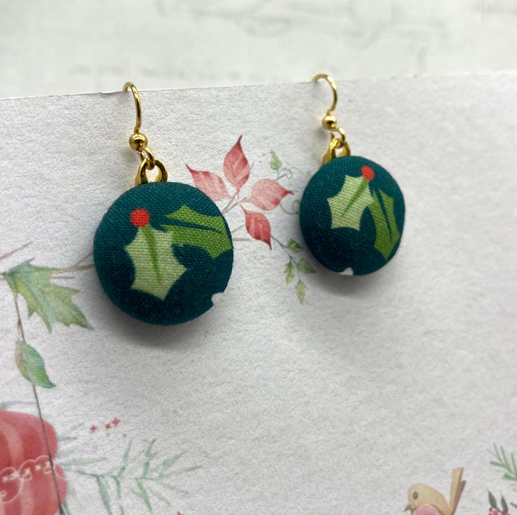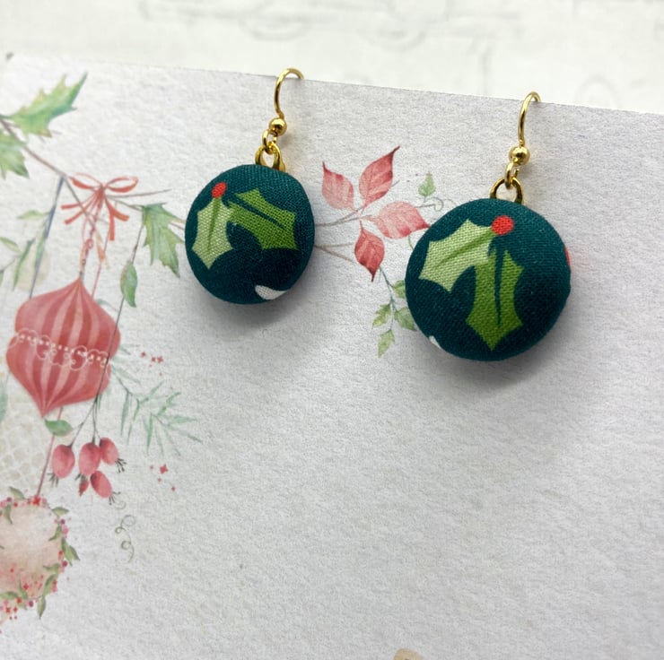 Bring out the festive cheer and wear these earrings all through the winter! Joyous holly leaves and berries adorn these cute fabric button dangle earrings.