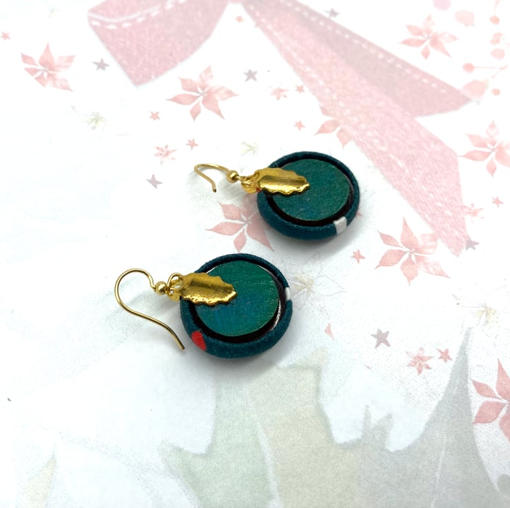 Made from organic 100% cotton fabric, with a deep green teal background and featuring holly, mistletoe and retro inspired gnomes - I've chosen two sprigs of holly to create these earrings!