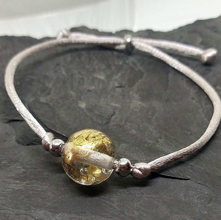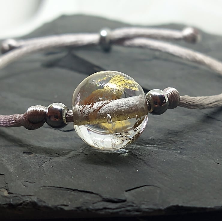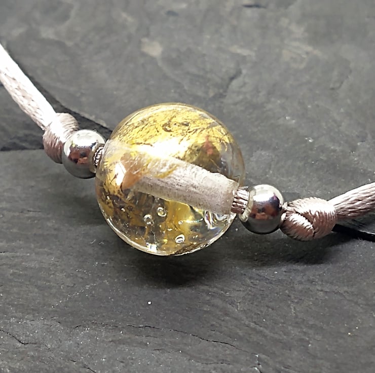A single 14mm clear orb bead decorated with 23k gold leaf on silver satin cord. These beads are carefully hand crafted to order by hand which means there will variations between each one making your bead unique to you.