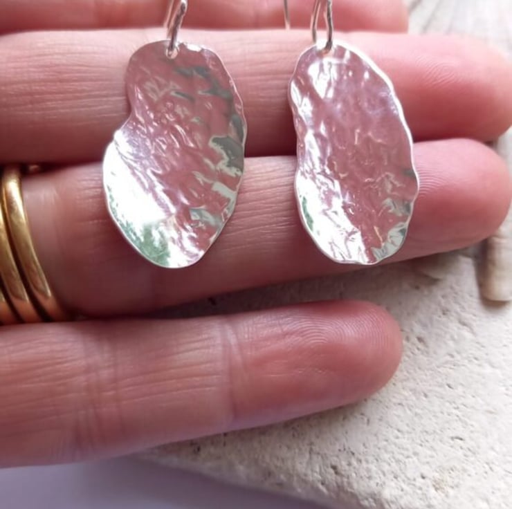 No two pairs are alike, each bears the unique hammer marks which are a part of it's design. These create fabulous light reflections.