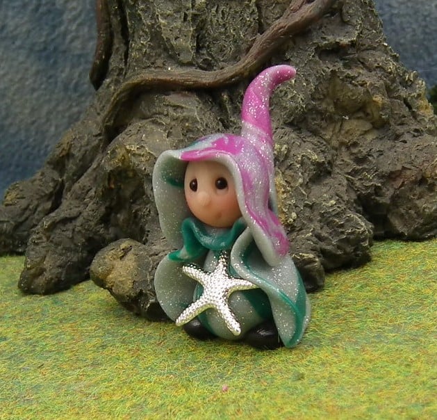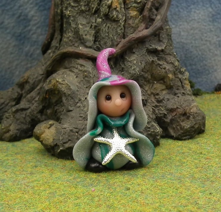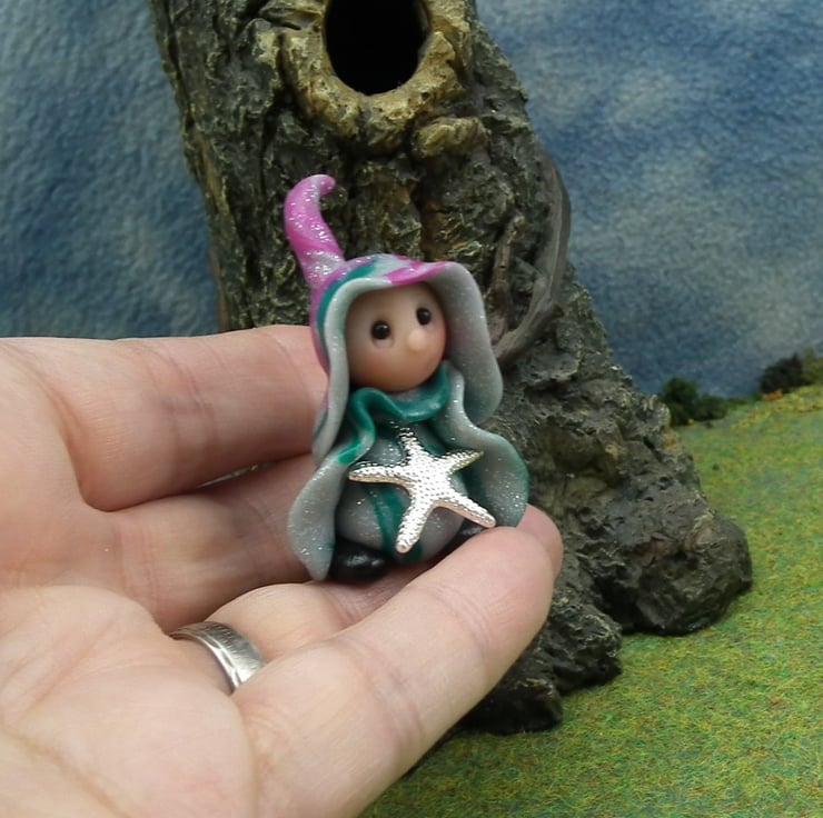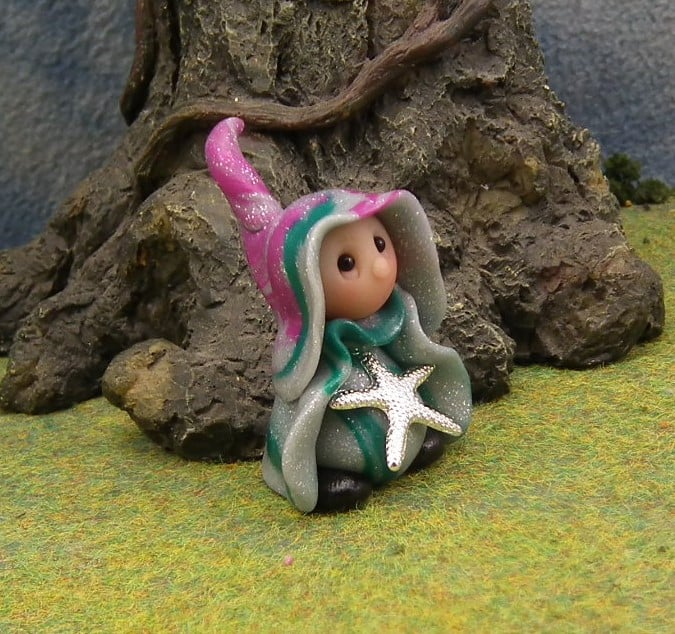 This is a 'one of a kind' creation having been entirely handmade without the use of moulds here at my studio on the Sussex Coast. Modelled with artist blend polymers before sealing with lacquer, Osta has sparkling black onyx eyes and metallic starfish. Osta the Beachcomber Gnome is just one and a half inches tall.