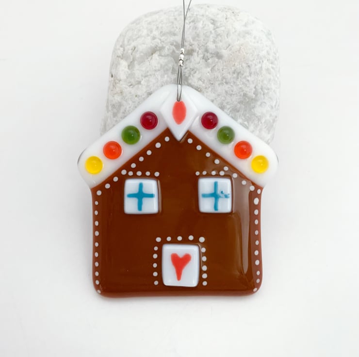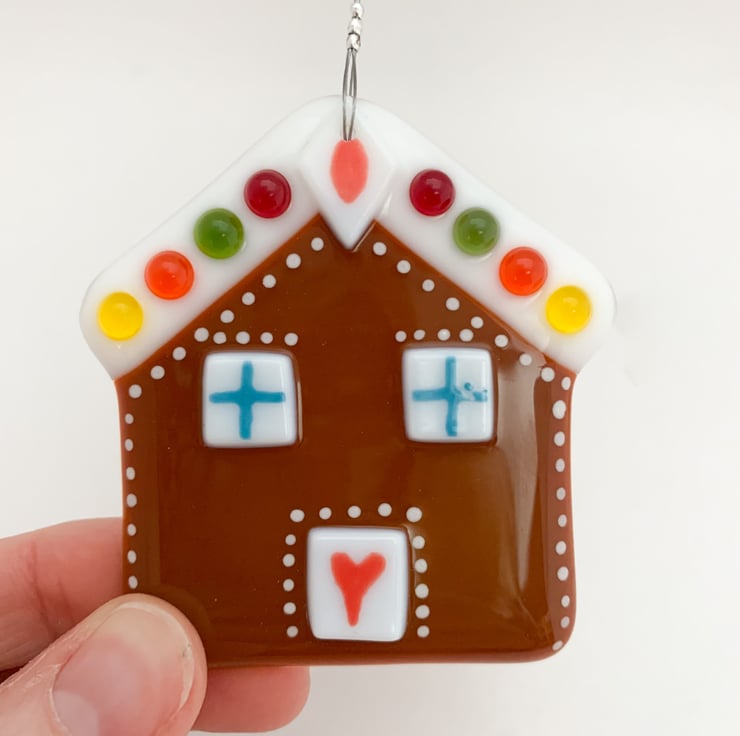 Fused glass hanging gingerbread house Christmas decoration. This looks lovely on a Christmas tree and would make a great postable gift.