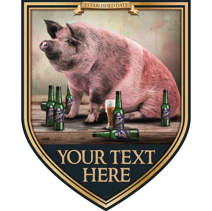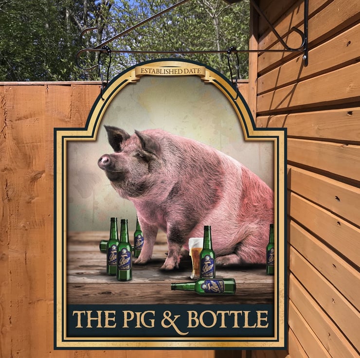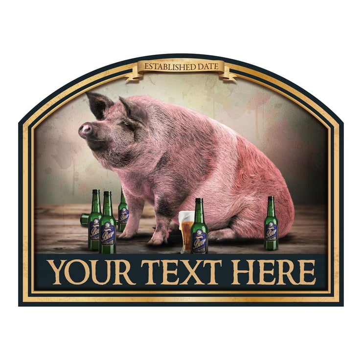 A personalised Bar sign featuring a large pig surrounded by beer bottles.