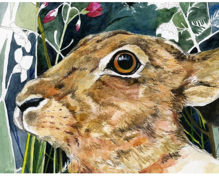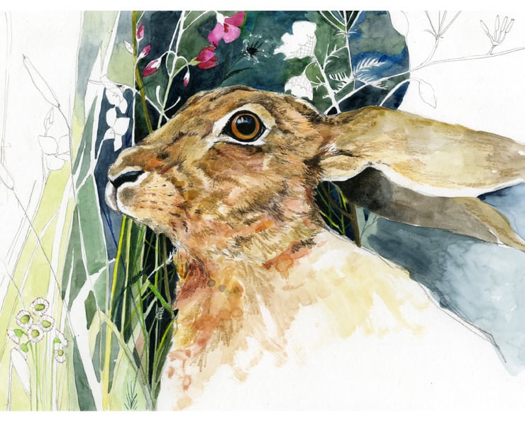 A4 sized (8x11inche) Giclee print of a hare sitting among the flowers.