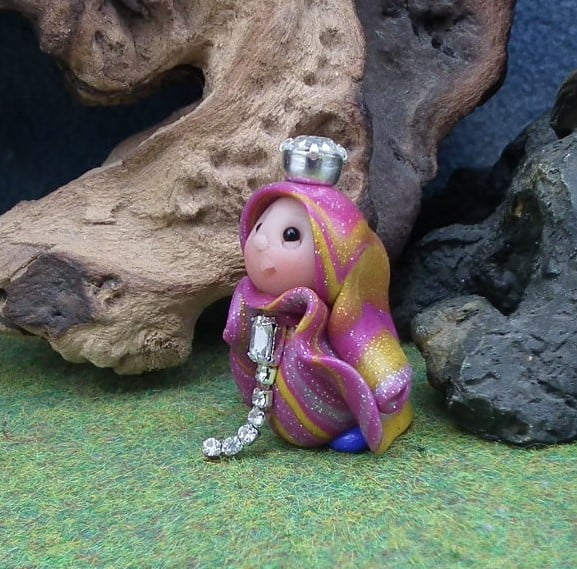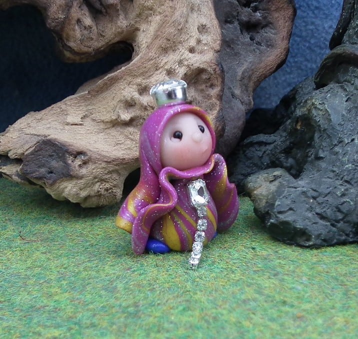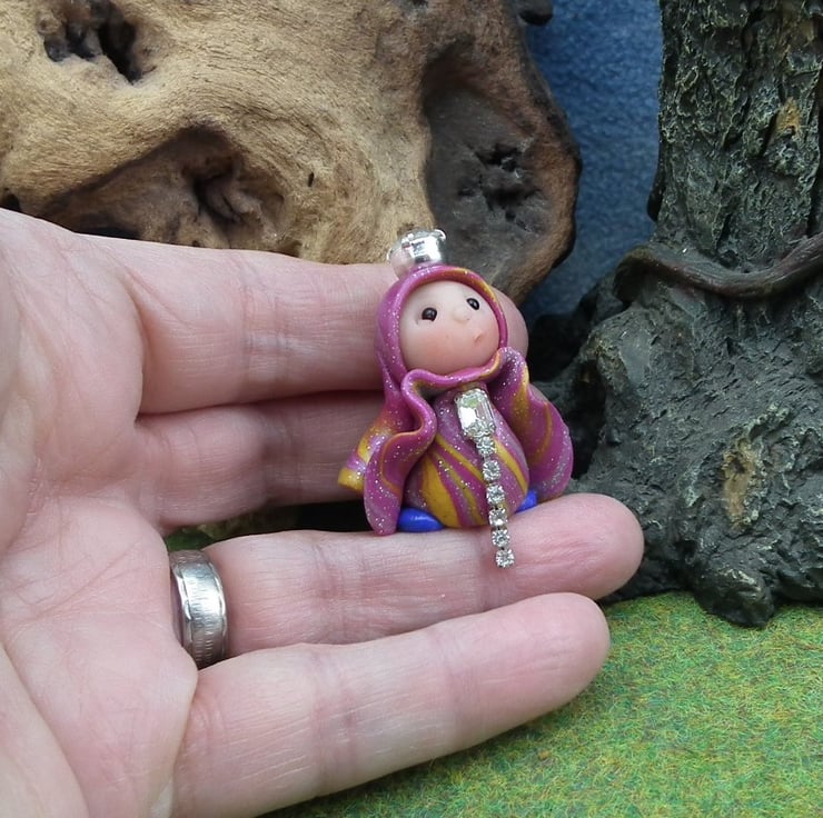This is a 'one of a kind' creation having been entirely handmade without the use of moulds here at my studio on the Sussex Coast. Modelled with artist blend polymers, blushed before sealing with lacquer, Polly has sparkling black onyx eyes and variegated robes. Polly the Magical Gnome is just one and a half inches tall.