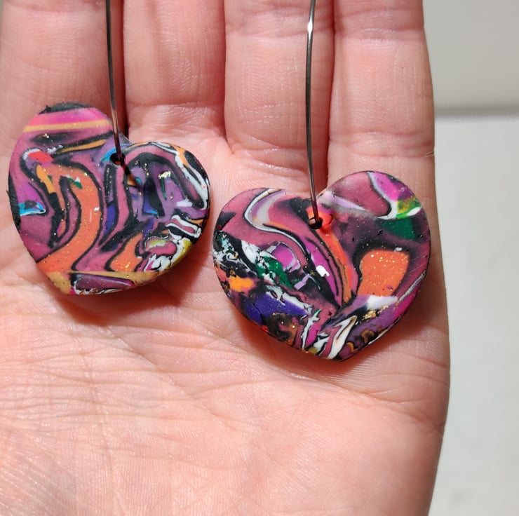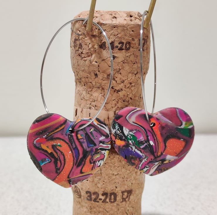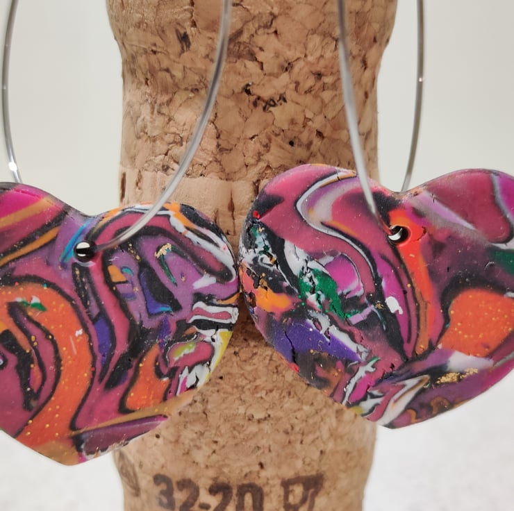 Hand made polymer clay earrings with an abstract pattern connected to a stainless steel hypo allergenic large hoop. Please see all photos for close up detail. All products handmade therefore there may be minor imperfections. Each pair sold as seen, message for more info