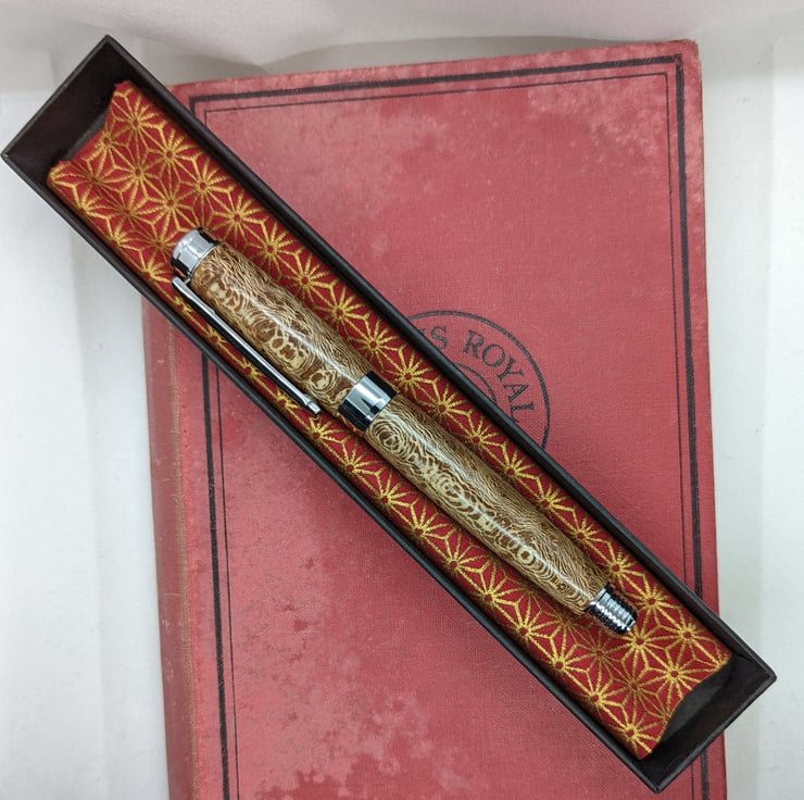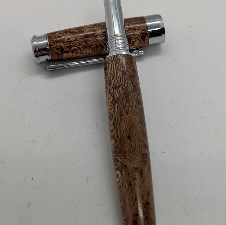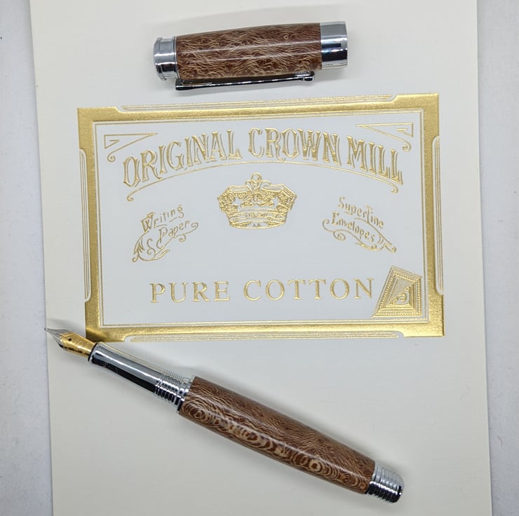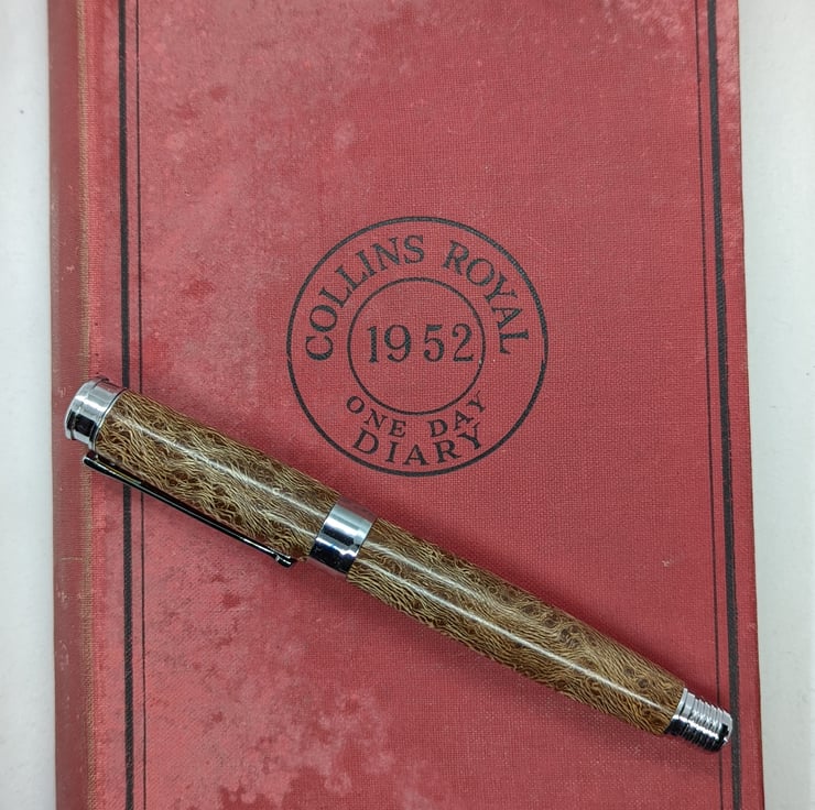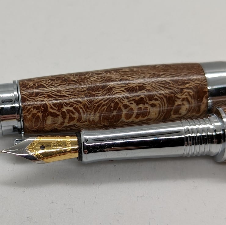 A hand turned fountain pen in London Plane. It is the most common and important tree in London and has an attractive golden-brown colour with dark brown flecks. This pen has additional speckling to add interest to the appearance. This is a high quality, well-designed pen with chrome metal parts that complement the colour of the wood. It has an upgraded German Beaufort premium nib as described by the manufacturer “As smooth as butter on the page, with an excellent ink flow” and converter to allow the use of bottled ink, it will also take standard cartridges and one will be supplied with the pen. It will be supplied in a material lined card box with one cartridge to get you started. F276