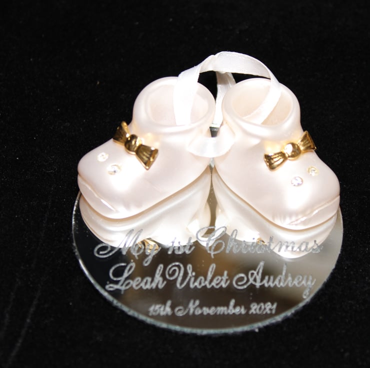 Each boot measures 2.5cm W x 2.5cm H x 4cm D; the mirror base measures 7.5cm in diameter, is engraved with your childs details and has a felt backing.