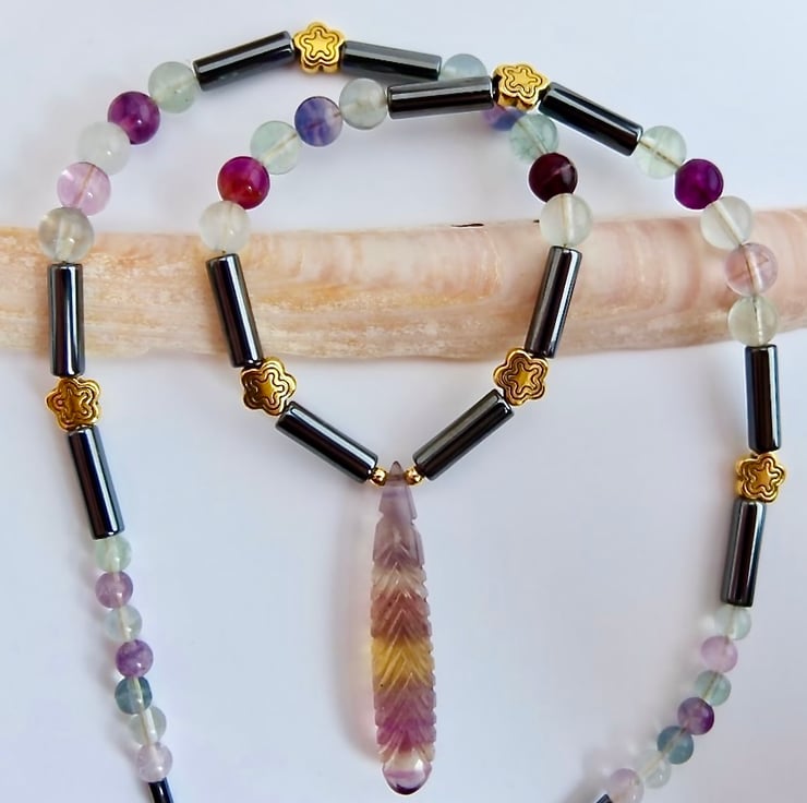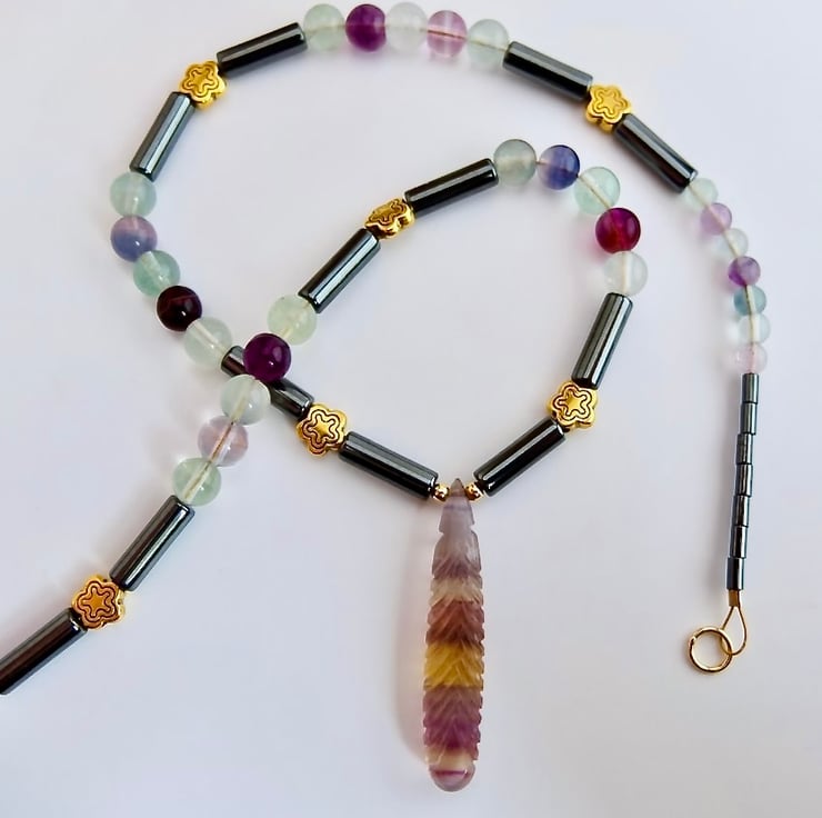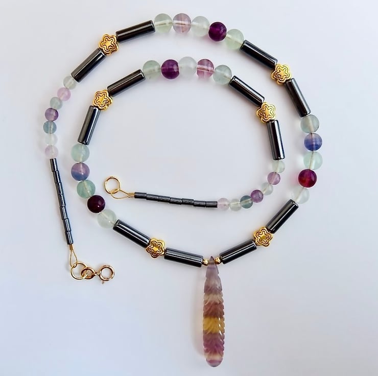 I love these fluorite beads with their almost luminous translucency and gorgeous range of colours, and the carved briolette is stunning.